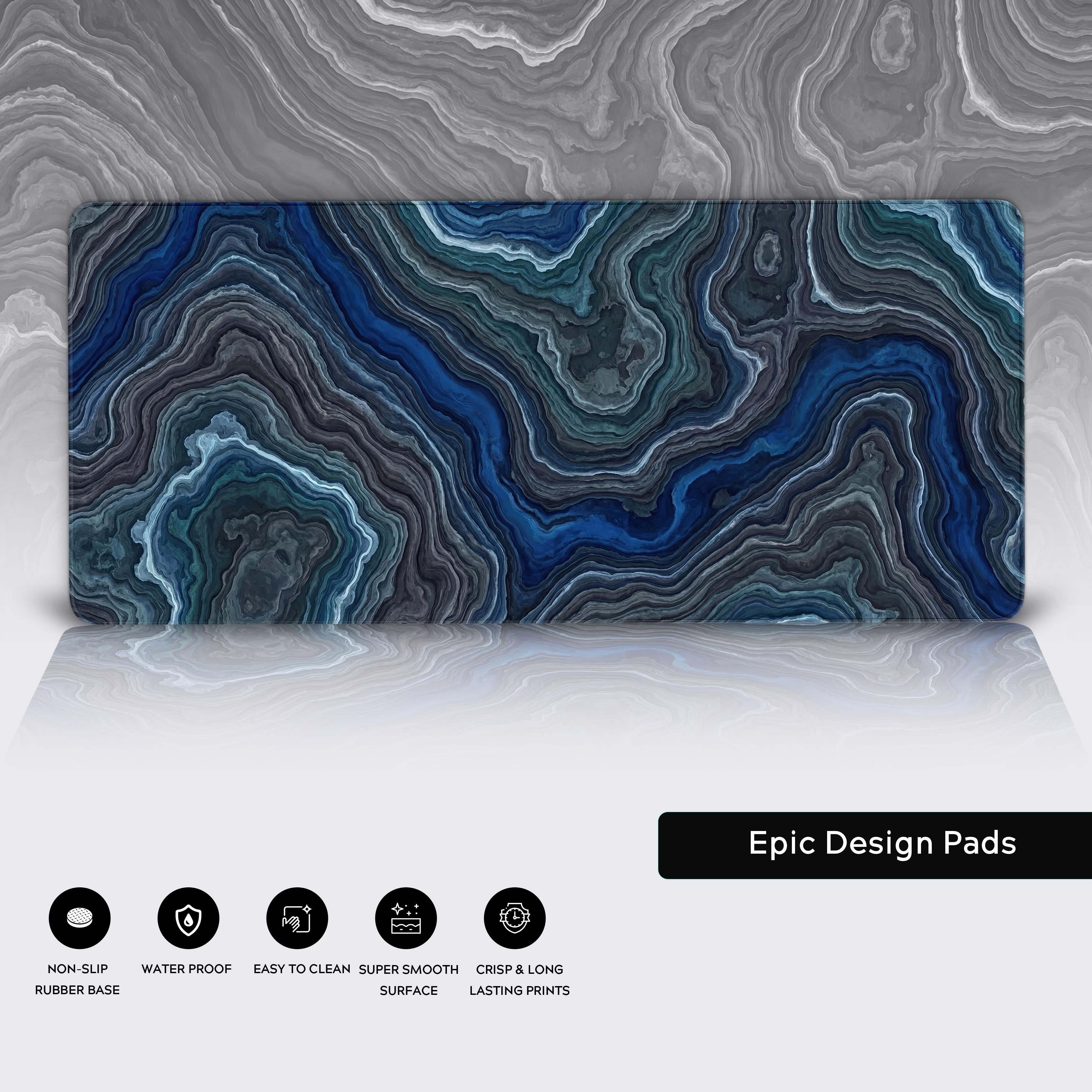 Transform your desk into a sanctuary of focus with the Deep Strata desk mat. Inspired by the stratified layers of an ancient agate geode, this design pulls you into a world of deep blues, teals, and charcoal grays. The fluid, intricate banding creates a workspace that feels both grounded and dynamic, perfect for high-level creative and strategic work.