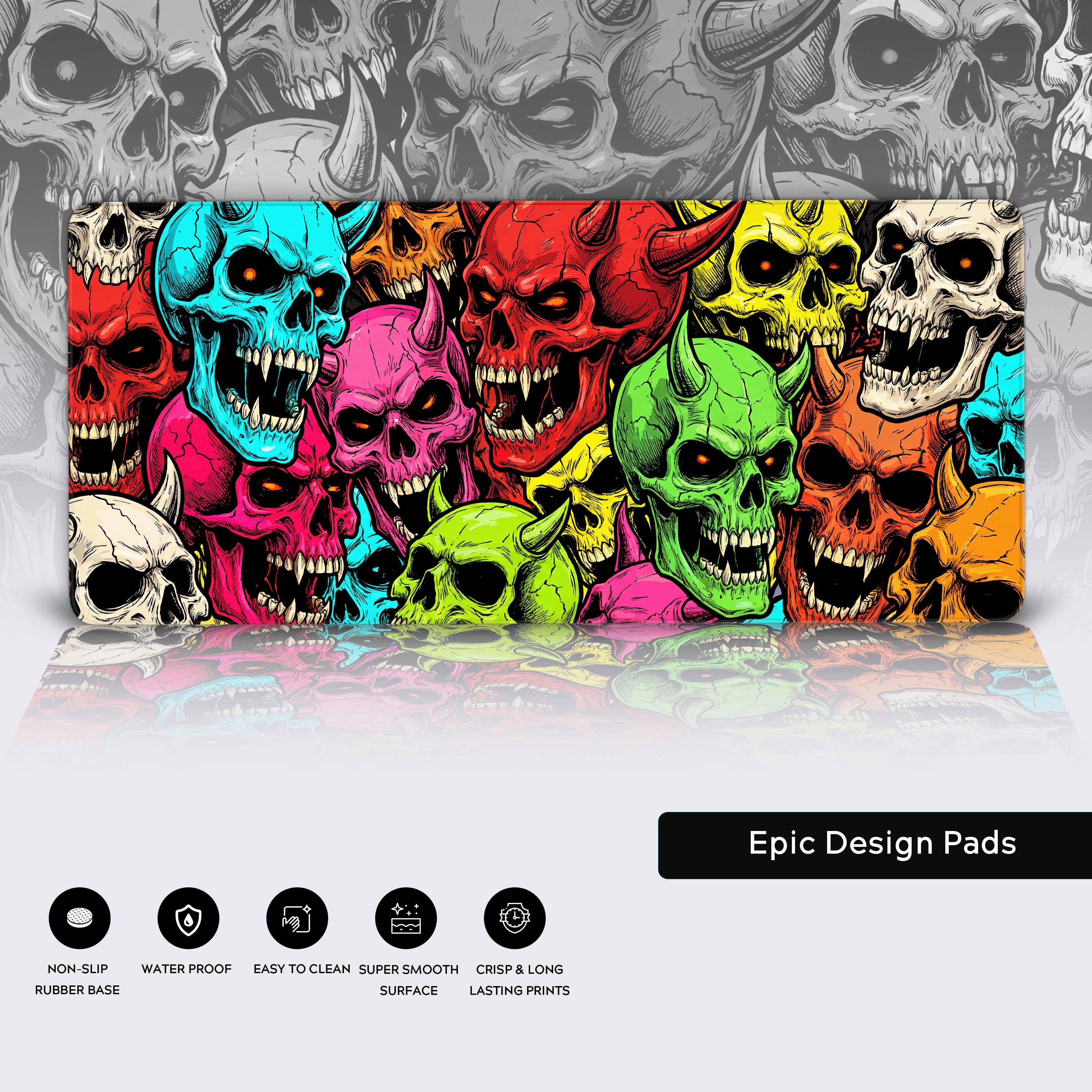 • Vivid Aesthetics: A chaotic pile of neon-drenched skulls in stunning cyan, magenta, and red brings an electrifying look to your setup.