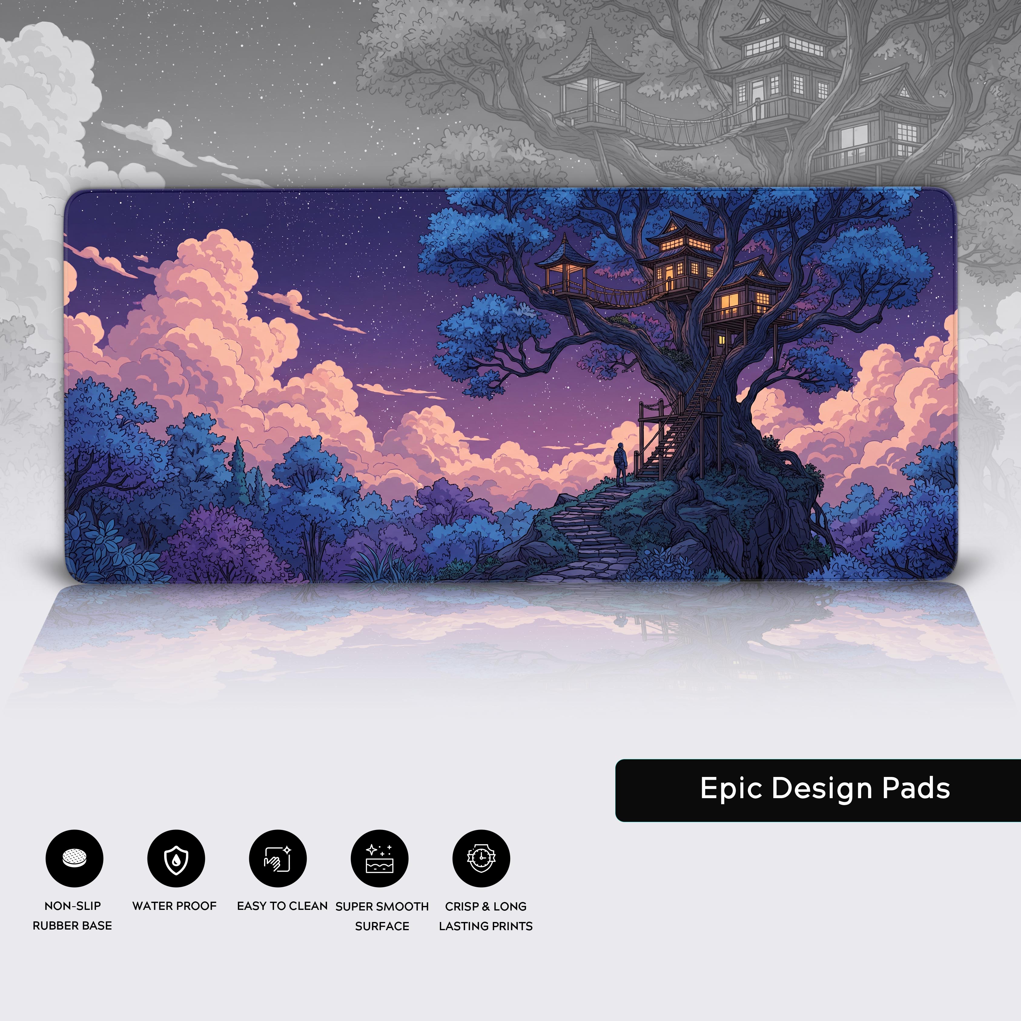 Escape the everyday and ascend to a world of tranquility with the Dreamer's Ascent desk mat. This design captures the magical threshold between the earth and the cosmos, featuring a magnificent treehouse nestled under a canopy of twilight purples and soft pink clouds. It’s a constant reminder that to find clarity, sometimes you just need to climb higher.