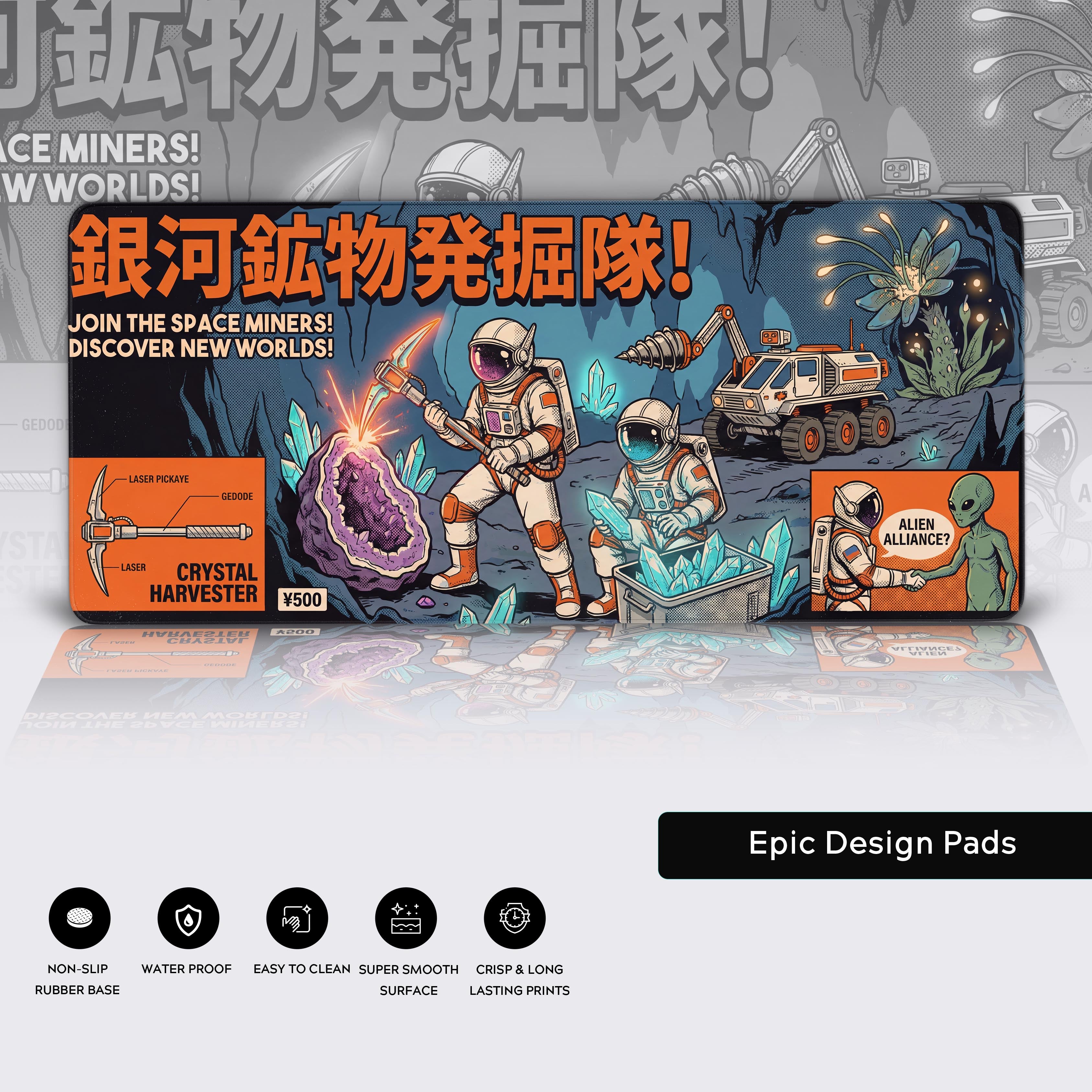 Imagine your keyboard and mouse gliding over a scene of cosmic exploration, where brave pioneers harvest luminous crystals and diplomacy extends to the stars. The nostalgic halftone textures and bold Japanese typography will fuel your daily quests for innovation and creativity.