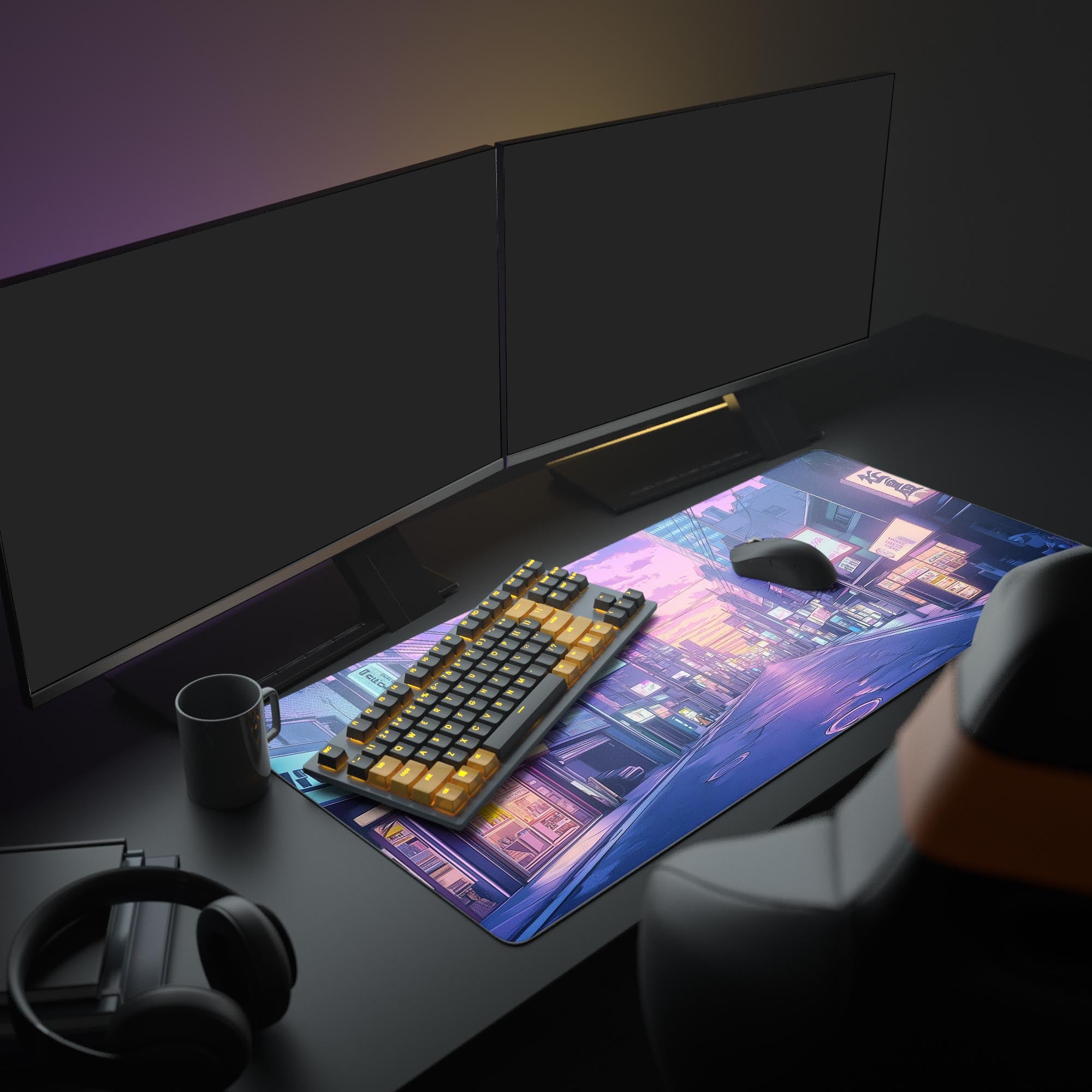 Enhance your workspace with the Tokyo Lofi Desk Pad, a fusion of function and artistic expression. This desk pad captures the dreamy essence of a cyberpunk Tokyo street at sunset, with neon-lit signs and a futuristically serene cityscape. Let the soft pastel pink and purple hues of the sky whisk you away to a nostalgic lofi atmosphere, with a cinematic composition that transforms your desk into a vibrant yet peaceful urban escape.