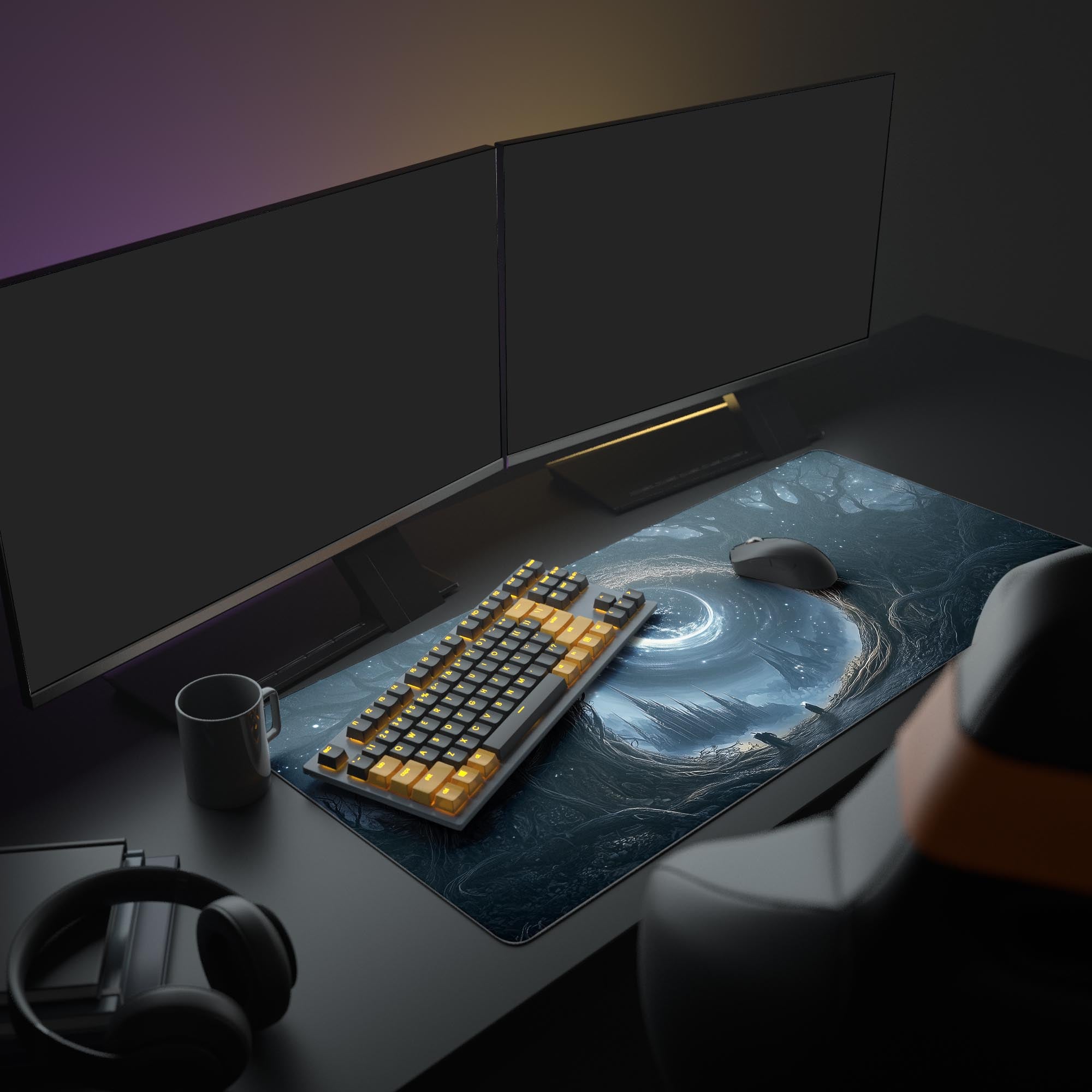 Transform your workspace into a mesmerizing apocalyptic scene with the End Of Time Apocalyptic Portal Desk Pad. This unique desk mat features a stunning depiction of a glowing celestial portal, surrounded by dark, ancient tree roots. The swirling cosmic void within the portal, coupled with intricate constellations and a luminous crescent moon, adds a captivating touch to any desk.