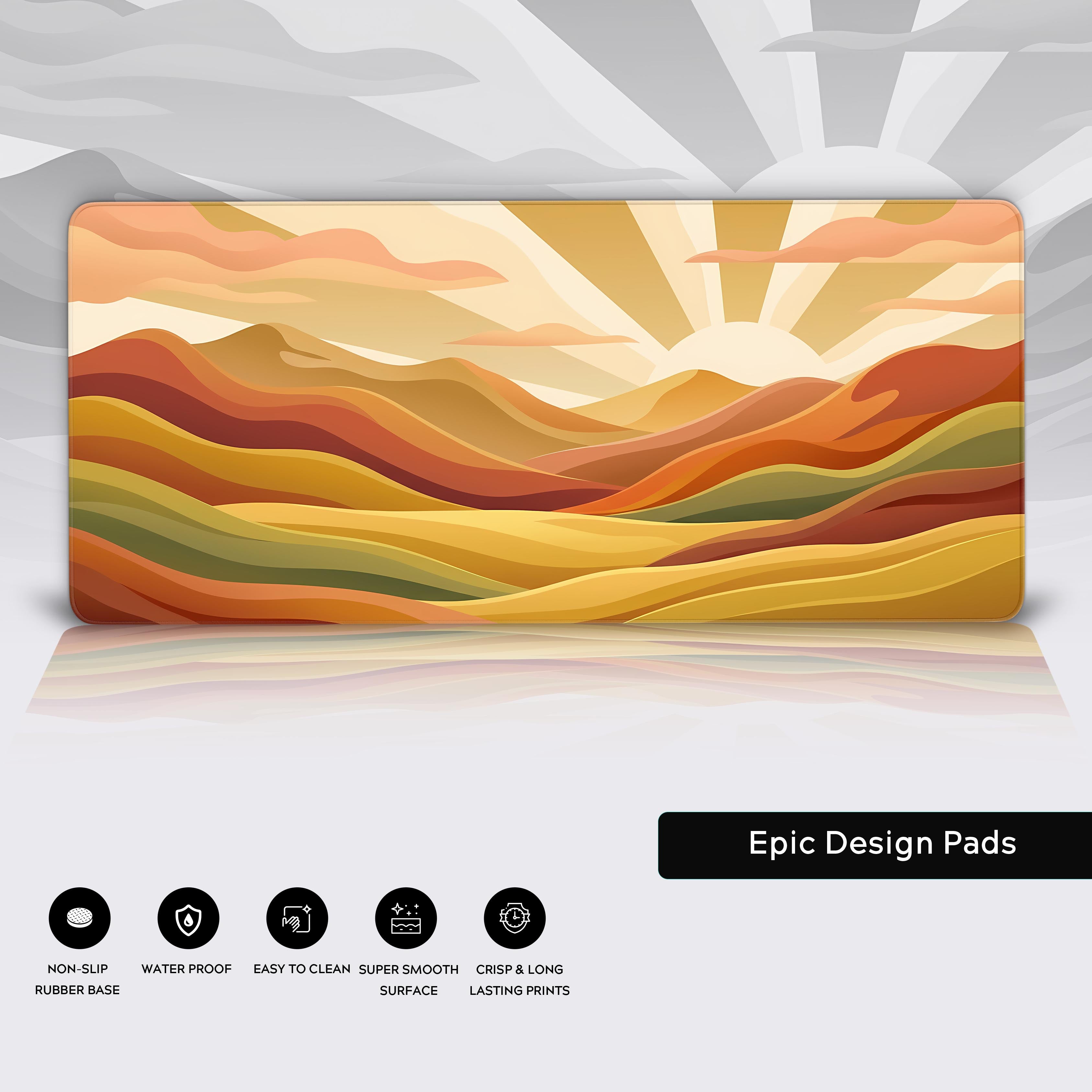 Is your workspace cold, sterile, and killing your creativity? The Golden Horizon desk mat is the antidote. It captures the eternal 'Golden Hour,' bathing your desk in the warm, clarifying light of a perfect sunset. The rolling layers of ochre, rust, and olive represent your daily challenges, smoothed by a new perspective.