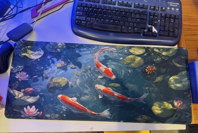 Immerse your workspace in tranquility with our "Koi Serenity" desk mat. This vibrant design captures the peaceful elegance of a traditional Japanese koi pond, bringing its calming beauty directly to your desk. Three magnificent koi fish, adorned with striking orange and white patterns, glide gracefully through crystal-clear waters, surrounded by lush green lily pads and delicate pink lotus blossoms.