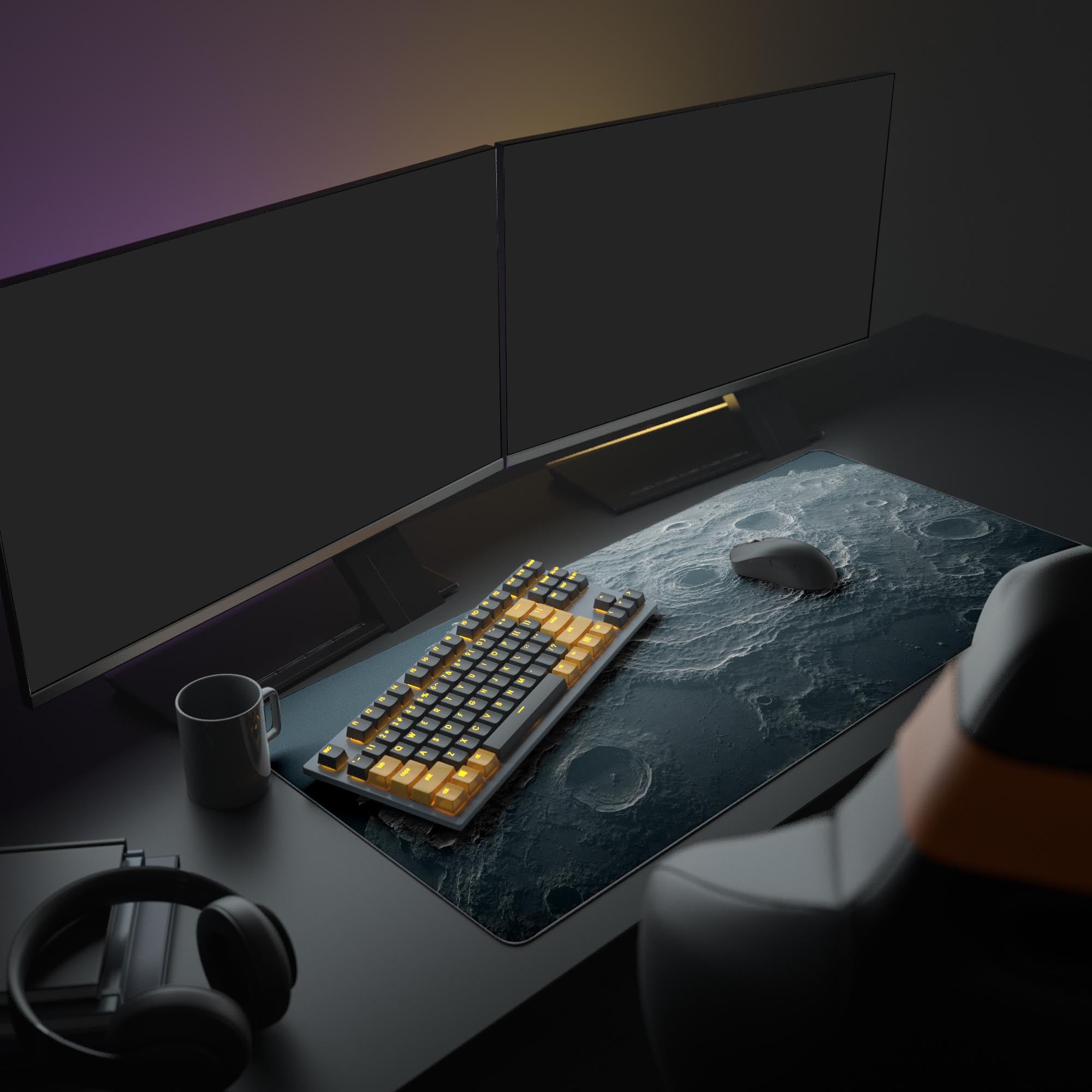 The stark interplay of shadow and light creates a surface that feels almost tactile, turning the desk into a window overlooking the dark side of a moon. It rejects the noise of color for the brutal elegance of grayscale, offering a backdrop that absorbs distraction rather than creating it. This piece is for the minimalist who finds focus in the void, understanding that true depth is often found in the darkest places. It stands as a testament to the fact that even in the emptiest corners of the universe, there is structure and profound, silent power.
