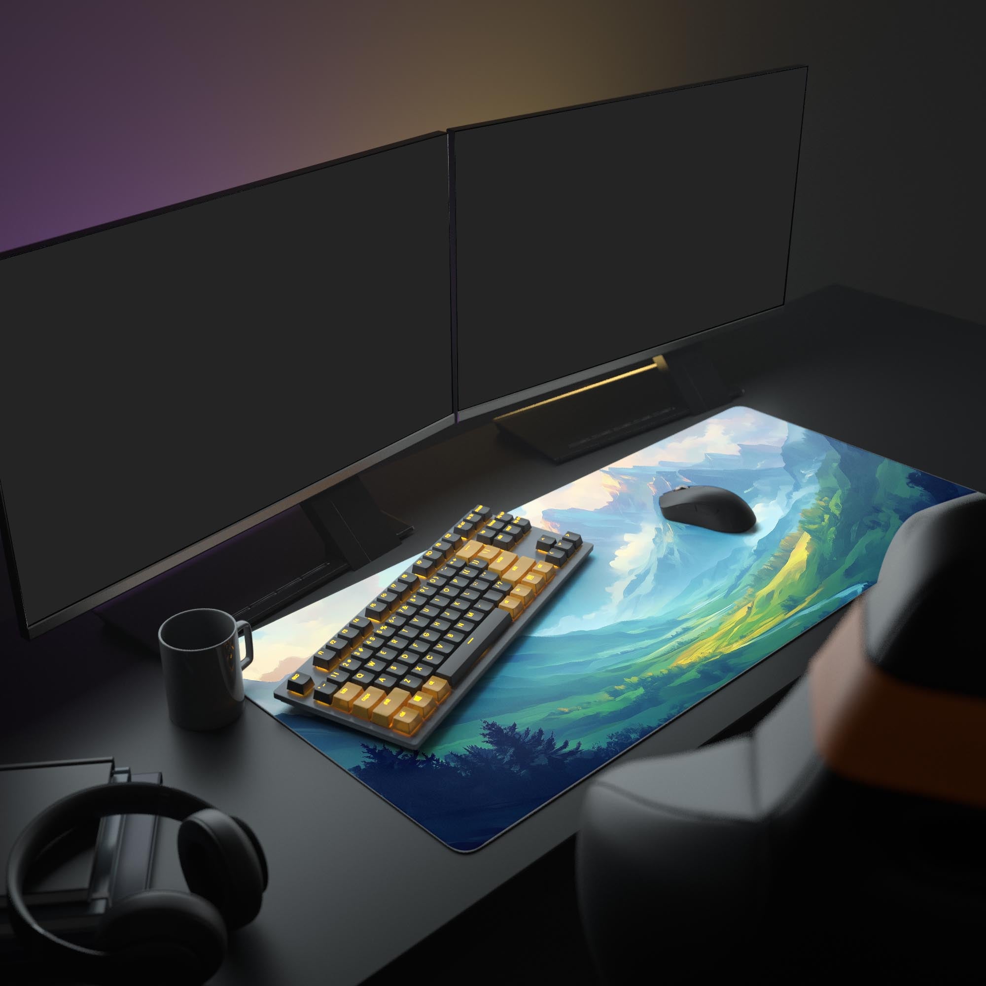 Our design captures a stunning, painterly landscape adorned with soft hues of blue and orange, creating a calm ambiance. It’s not just an accessory; it’s a piece of art that brings the outside in, perfect for home offices or gaming setups.