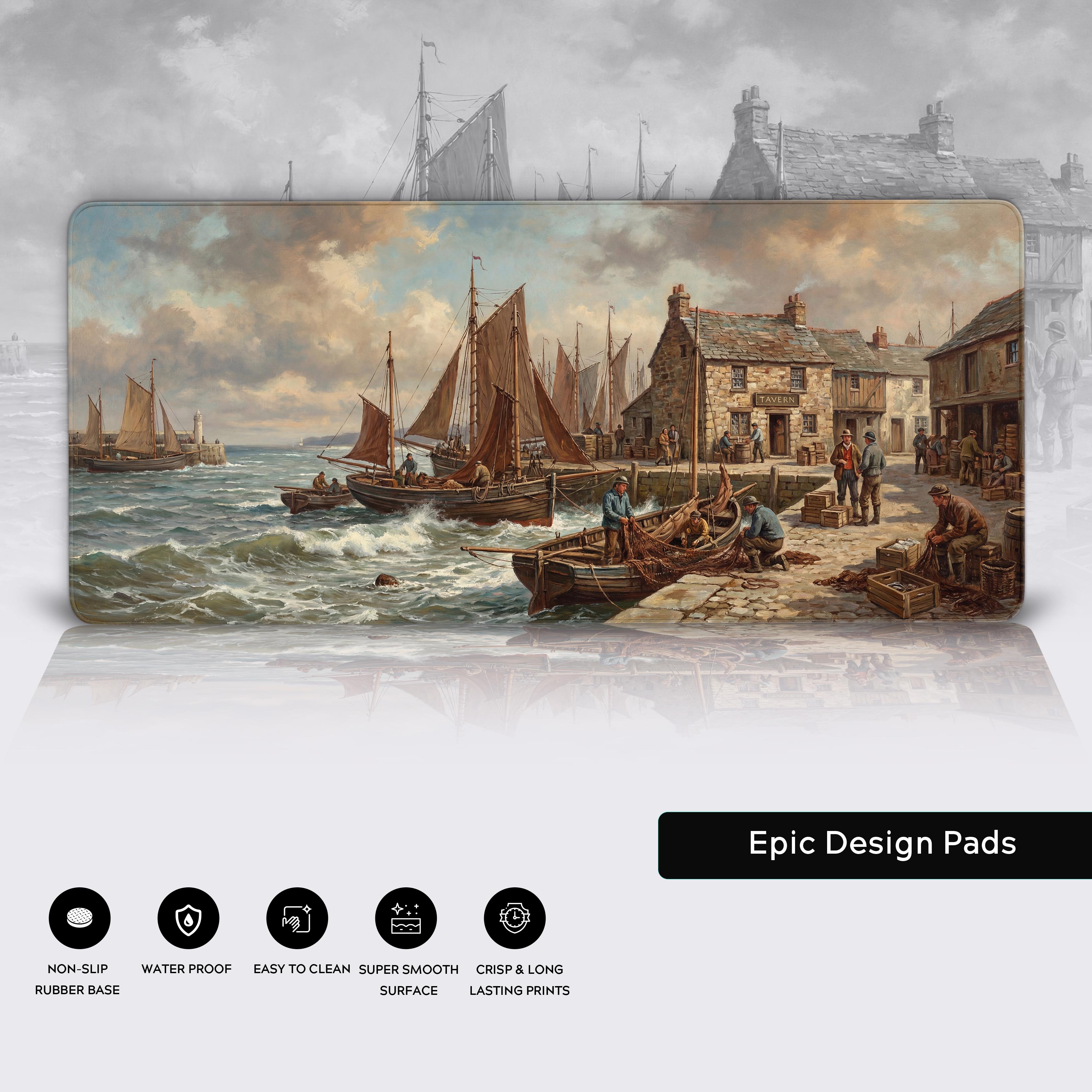 Transform your desk into a 19th-century port with the Harbor Trade desk mat. This classical oil painting captures the raw essence of a bustling fishing village, celebrating the grit and determination that built empires. It's a powerful tribute to the dignity of the grind, reminding you that true prosperity is earned.