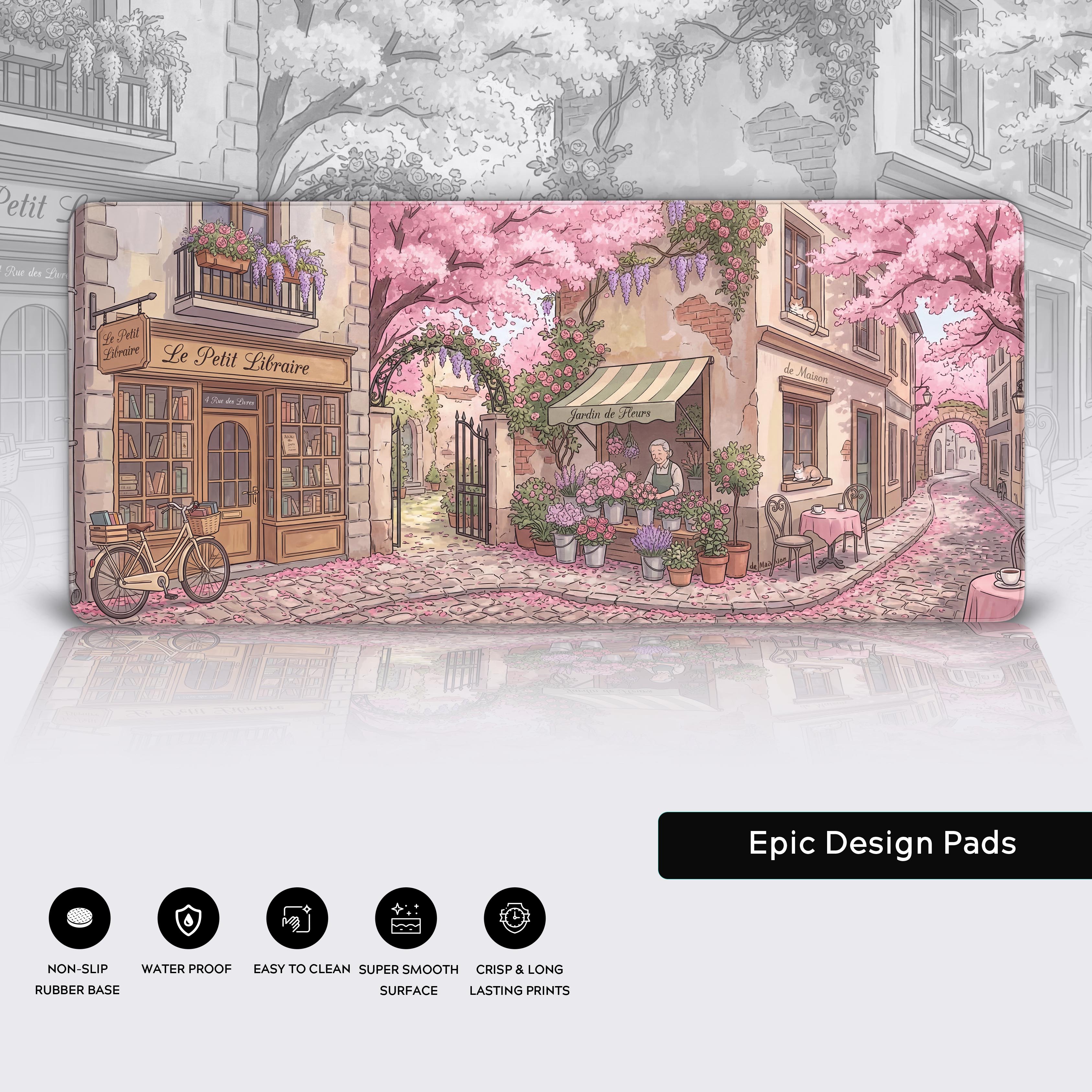 Transform your desk from a zone of chaos into a tranquil, sunlit sanctuary. The Parisian Spring desk mat invites you into a quiet European village, where a charming bookshop and a blooming flower stand meet under a canopy of soft pink blossoms. It’s an instant escape, designed to lower your heart rate and inspire creativity.
