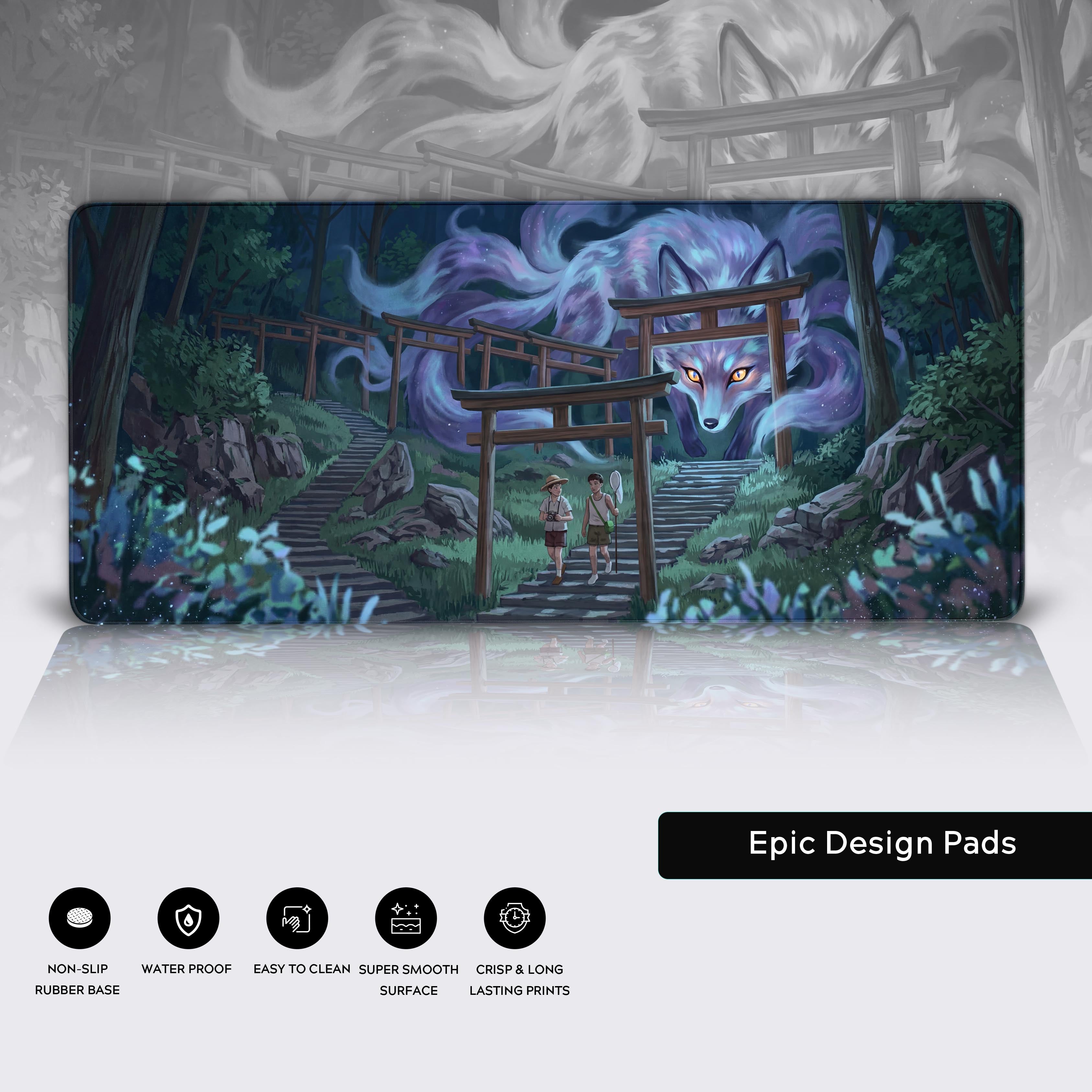 Ever feel like something mystical is watching just beyond your screen? The Spectral Guardian desk mat captures that exact feeling. This design freezes a moment in time: two friends on a summer adventure, completely unaware of the colossal, ethereal Kitsune spirit observing them through ancient Torii gates. It’s a stunning piece of magical realism for your desk.