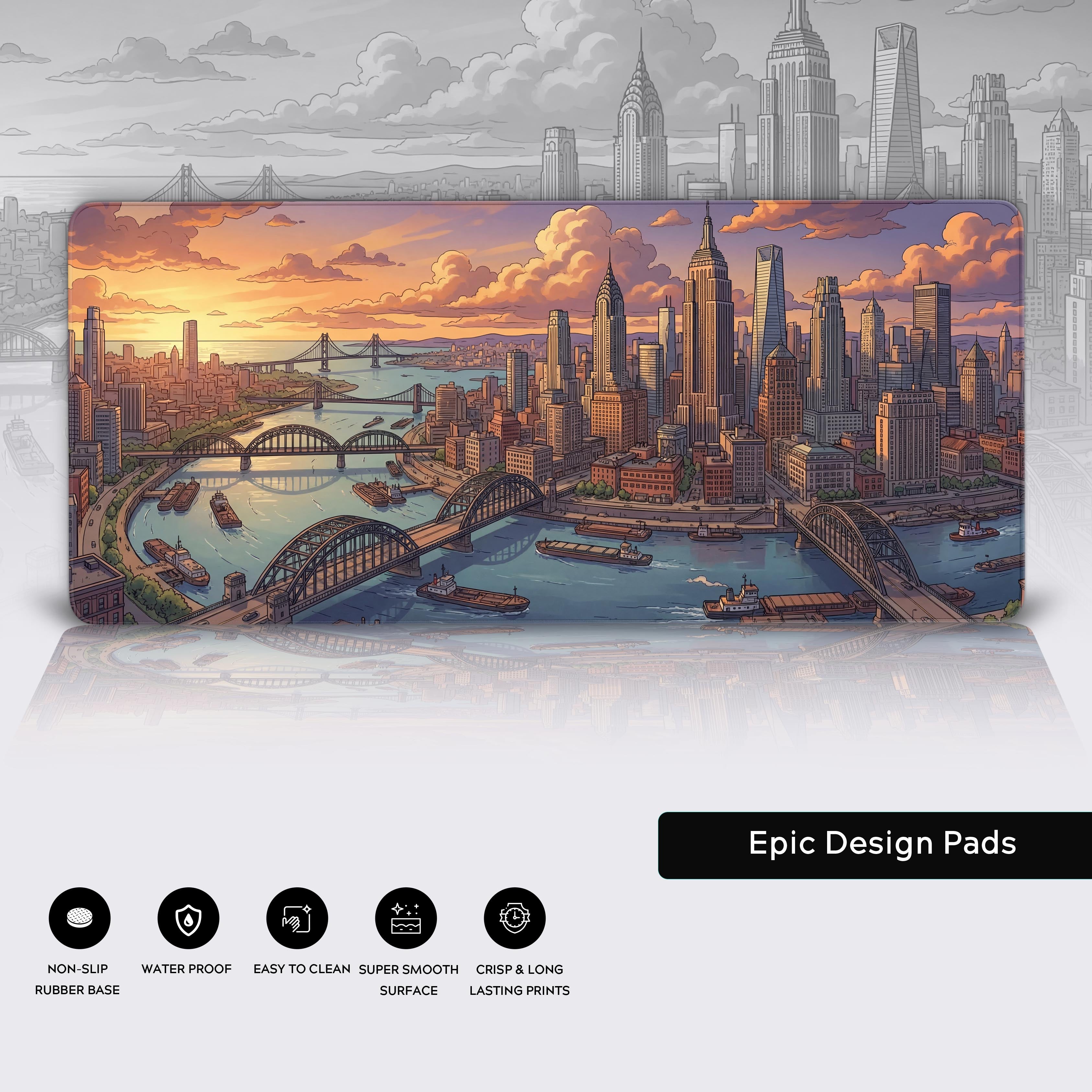 Transform your desk from a simple workspace into the command center of your empire. The Sunset Commerce desk mat captures the golden hour over a bustling city, a constant reminder that while others rest, your ambition is just getting started. The Art Deco spires reach for the sky, mirroring your own goals, while the intricate network of bridges and waterways represents the powerful connections you build.