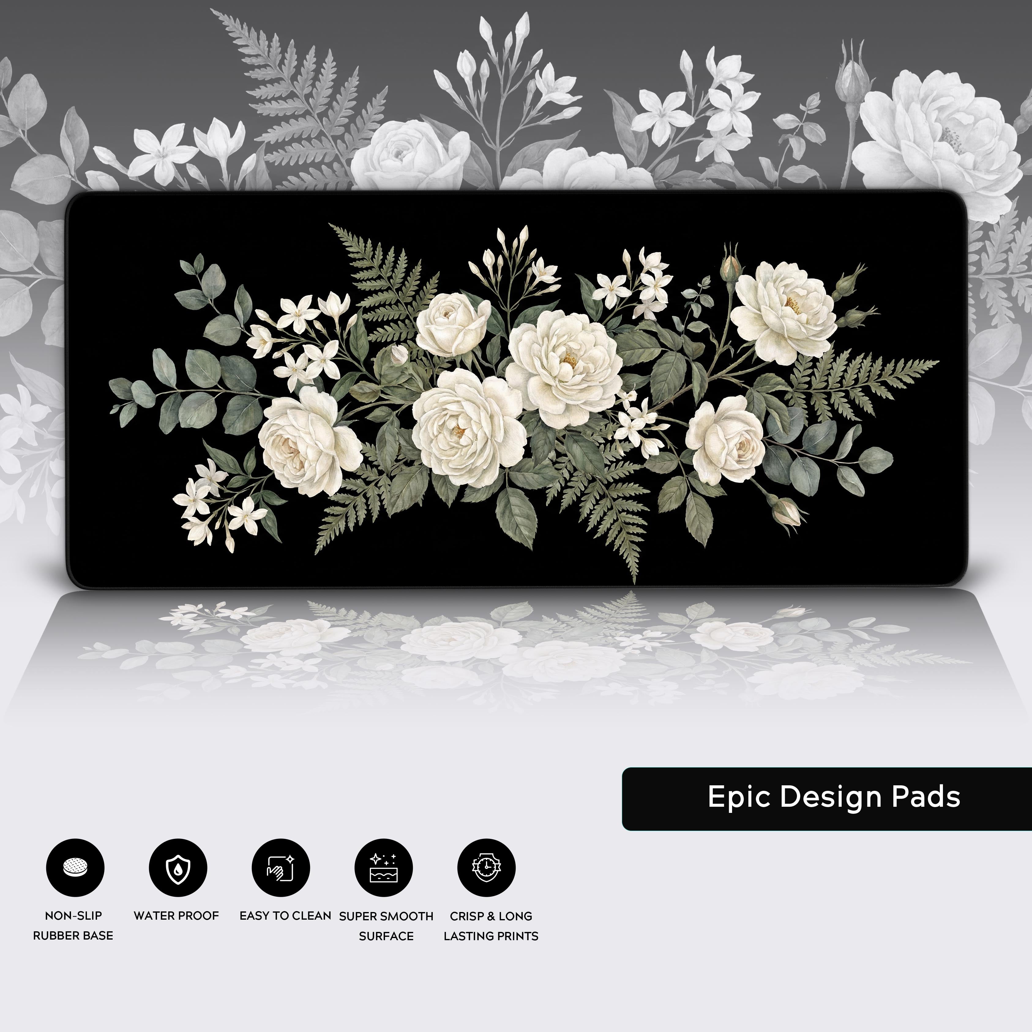 Silence the noise of your daily grind with the Obsidian Bloom desk mat. This isn't just decoration; it's a tool for focus. Against a deep black canvas, elegant white roses and detailed ferns stand in sharp, stunning contrast, representing clarity emerging from chaos.