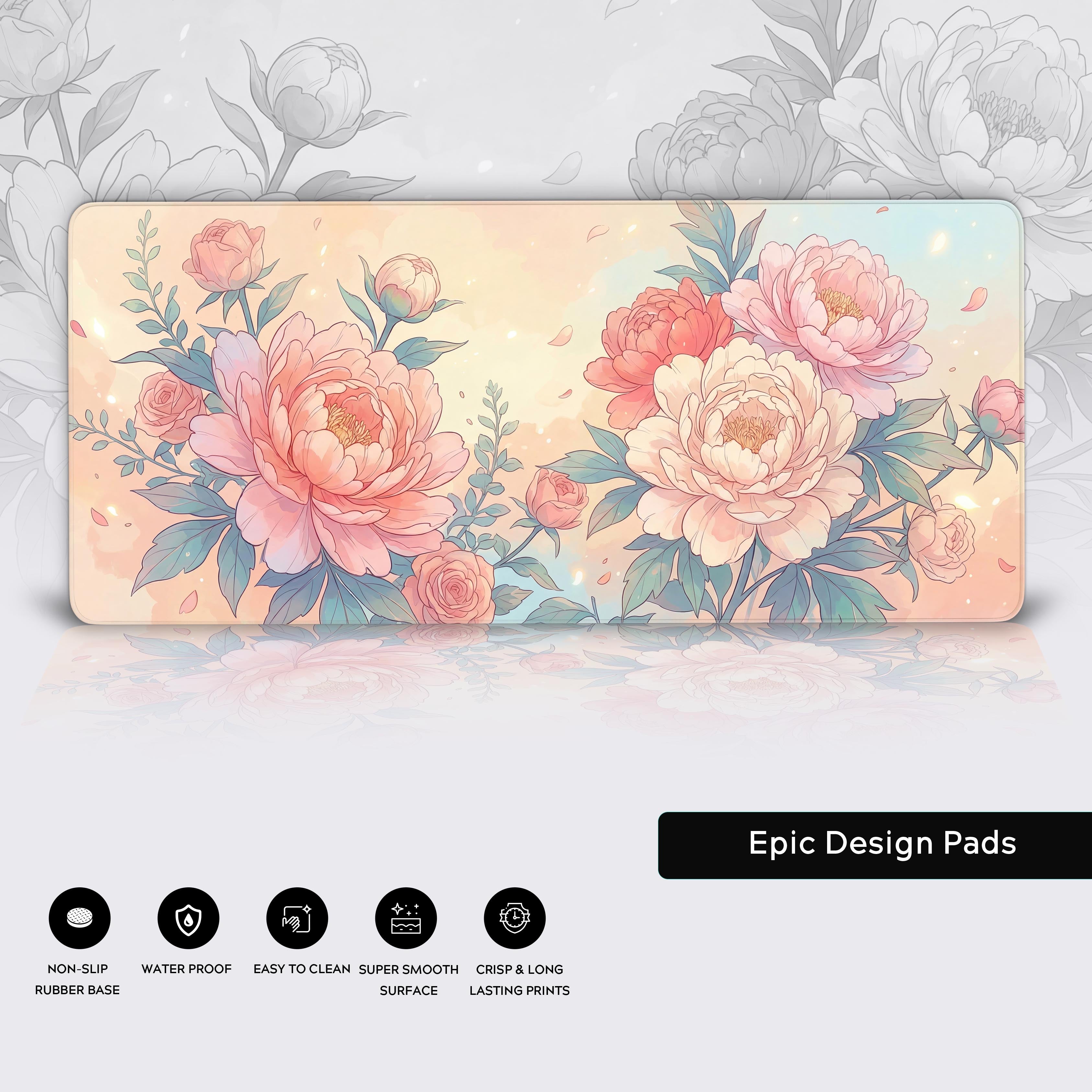 Escape the digital noise with the Pastel Bloom desk mat. This design captures the quiet beauty of a garden at dawn, where oversized peonies bloom in soft peach and pink hues against cool teal shadows. The gentle, watercolor-inspired art style turns your workspace into a sanctuary of calm and creativity.