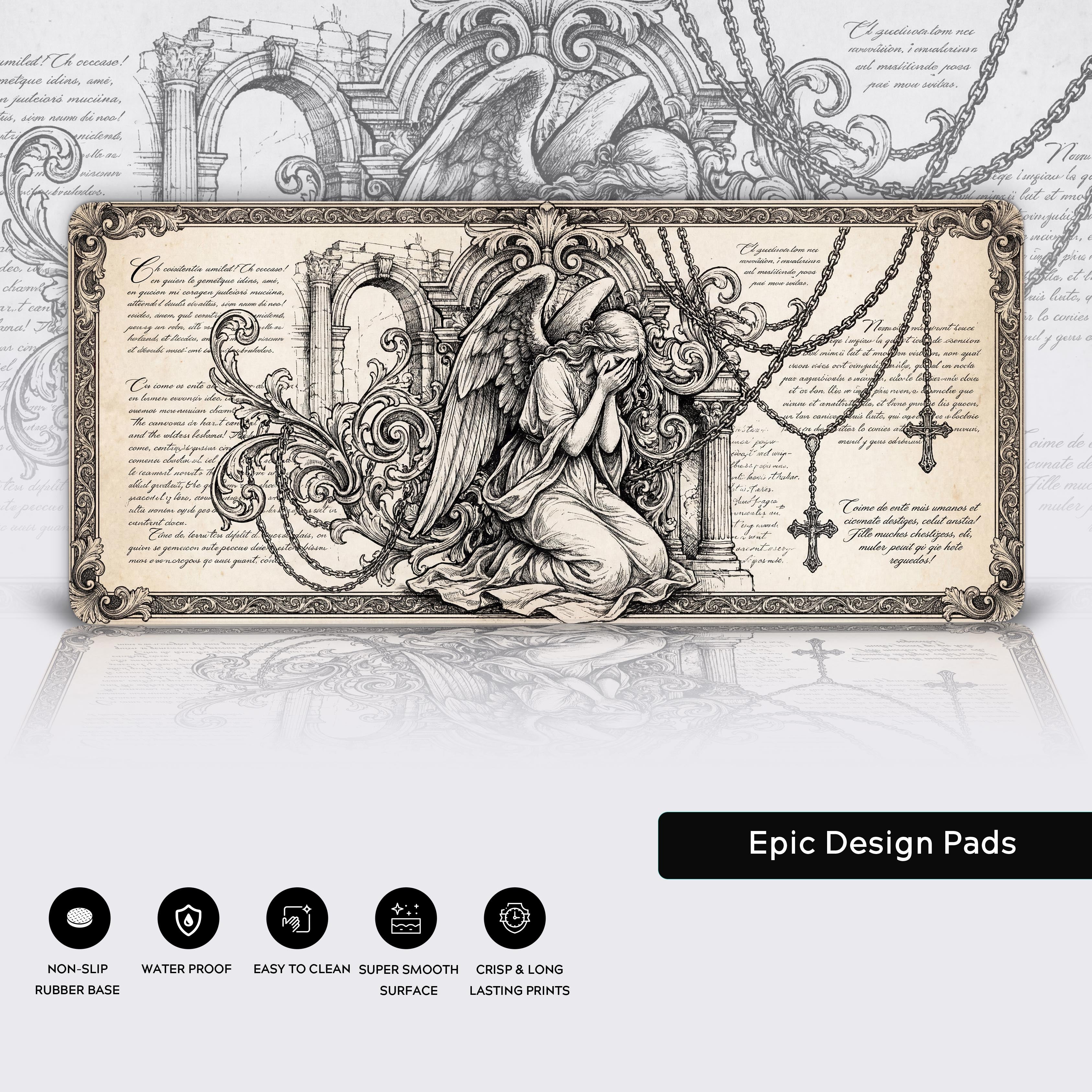 Transform your desk into a sanctuary of somber beauty. The Angelic Sorrow desk mat captures the eternal weight of grief, featuring a weeping angel bound by chains amidst the ruins of forgotten scripture. The intricate, engraving-style linework and parchment tones evoke a powerful Dark Academia aesthetic, perfect for those who find inspiration in the shadows.