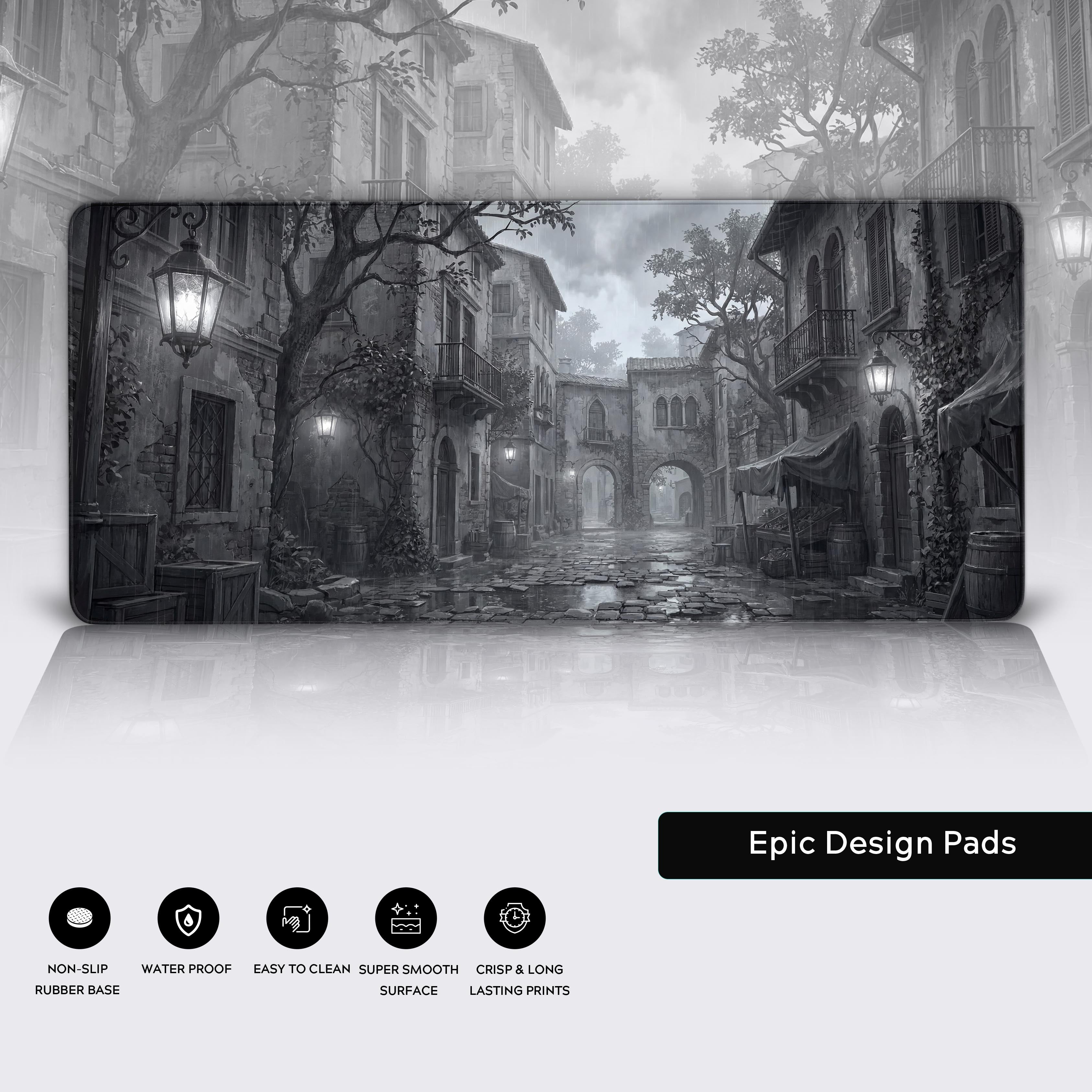 Escape the constant digital noise and anchor your workspace in the quiet solitude of a forgotten city street. The Silent Rain desk mat captures the profound peace of a downpour, its monochrome palette highlighting the texture of wet cobblestones and the gentle glow of lanterns.