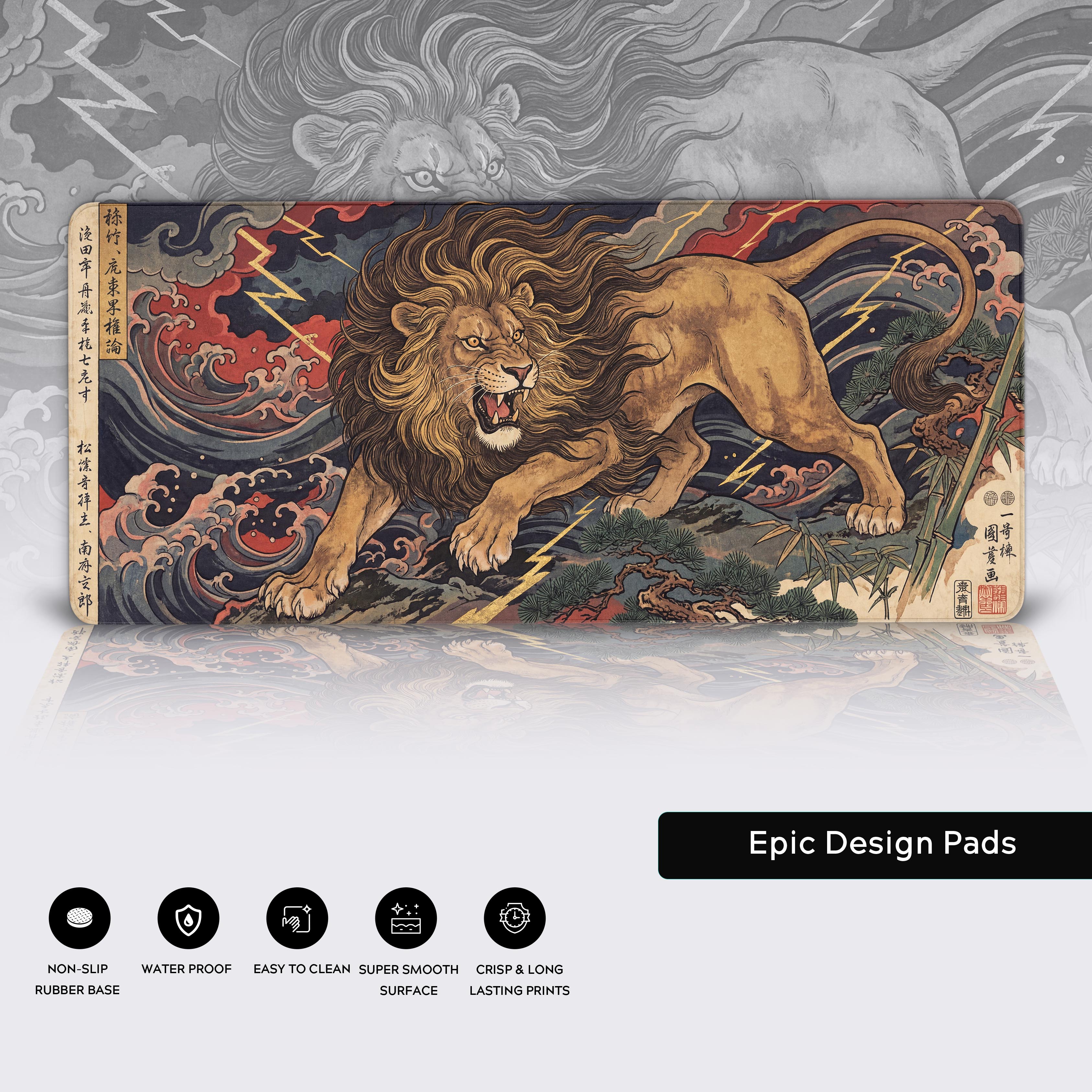 True authority doesn't whisper; it roars. The Imperial Roar desk mat channels the untamed energy of a tempest through a masterful Japanese woodblock art style. Featuring a powerful lion amidst crashing waves and jagged lightning, this design is a statement of focused intensity and decisive action.