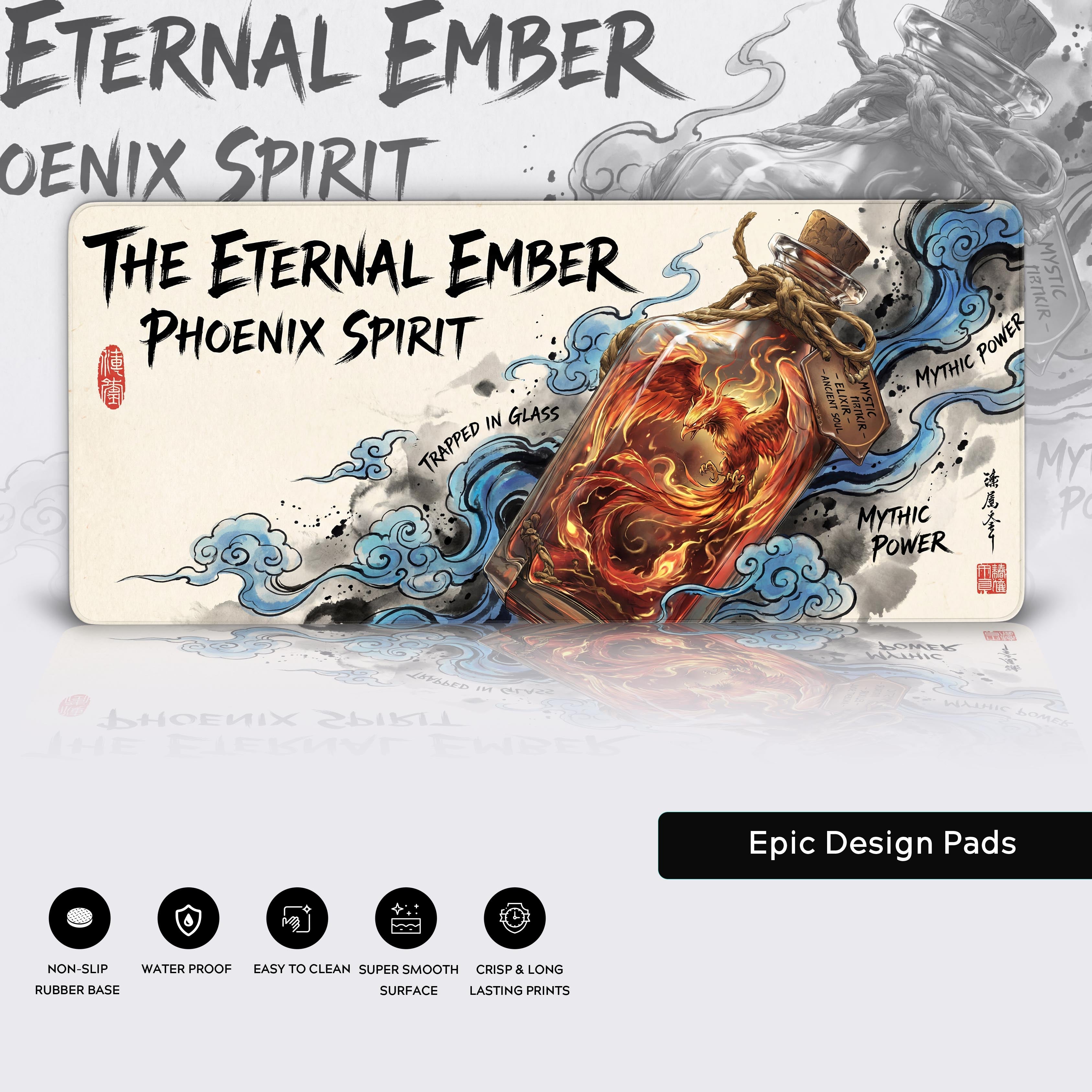 Capture the paradox of contained power with the Eternal Ember desk mat. This stunning design features the Phoenix Spirit, a blazing symbol of rebirth, beautifully rendered as a mystic elixir trapped in glass. The vibrant, fiery soul of the phoenix contrasts with traditional ink-wash clouds, creating a visual masterpiece for your workspace.