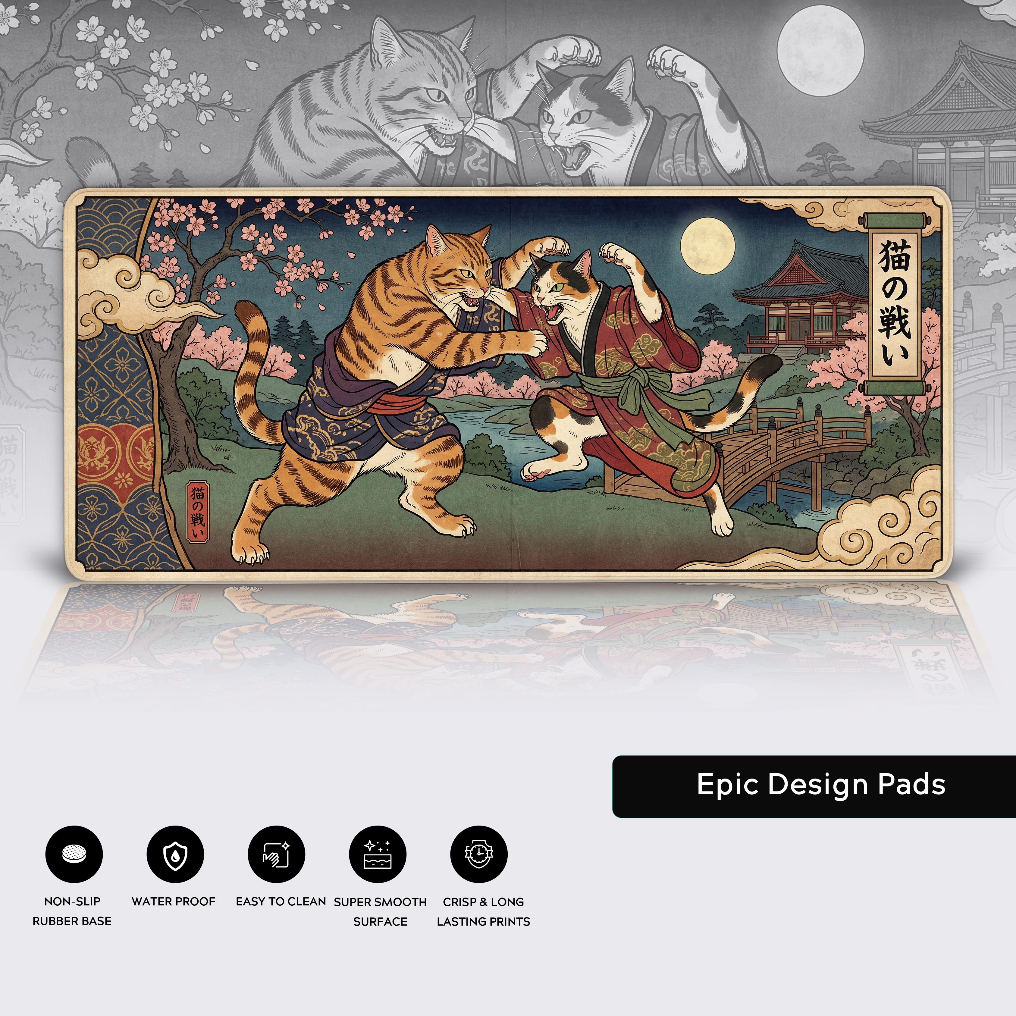 Tired of a bland workspace? Transform your desk into a masterpiece with the 'Feline Tussle' desk mat. This isn't just a mat; it's a portal to classic Japan, capturing a dynamic clash between two cats in the iconic Ukiyo-e woodblock style.