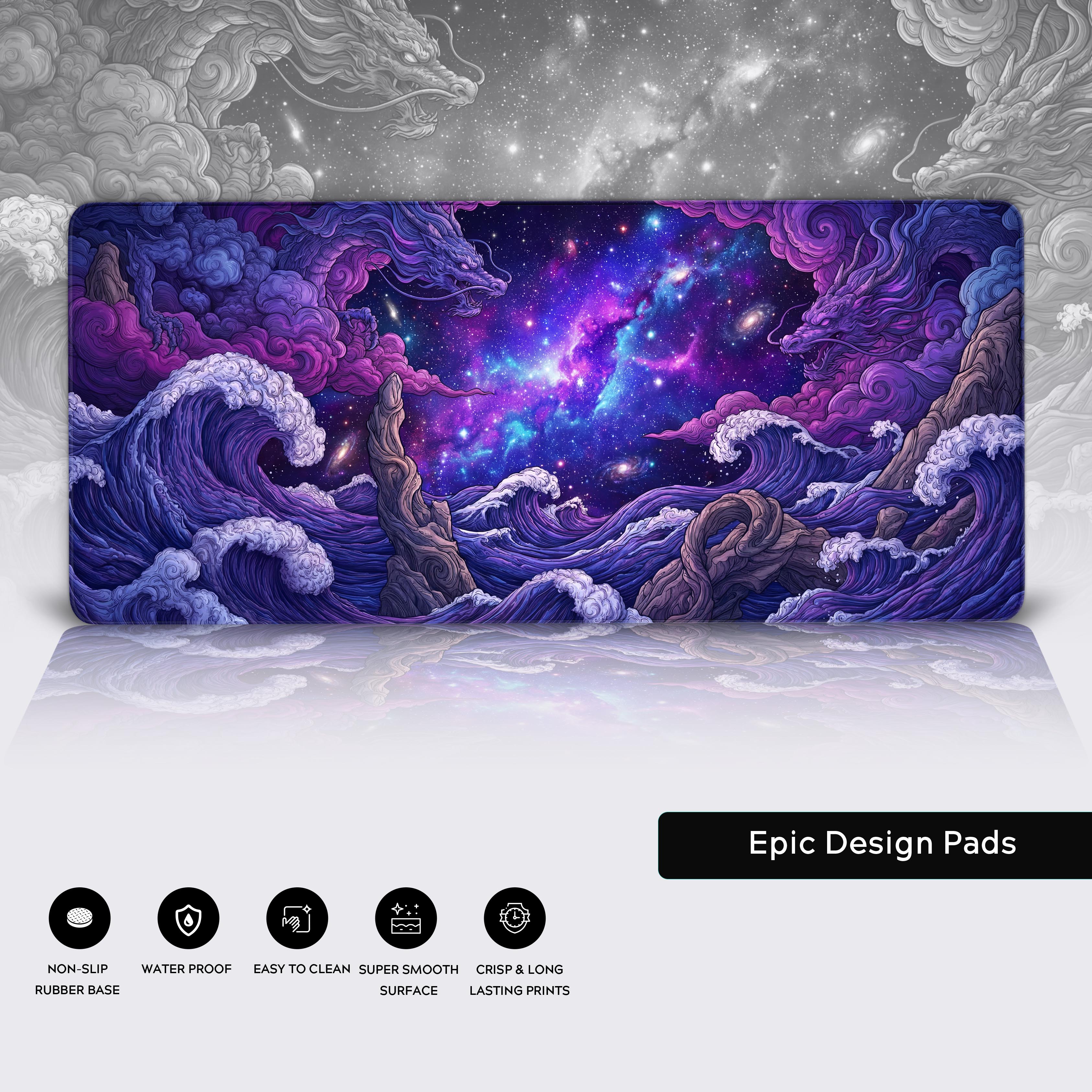 Watch as tumultuous, Great Wave-style currents dissolve into a vibrant nebula, framed by twin celestial dragons—guardians of the threshold between worlds. This is a design for the visionary, the ambitious, and the dreamer who understands that true potential knows no horizon.