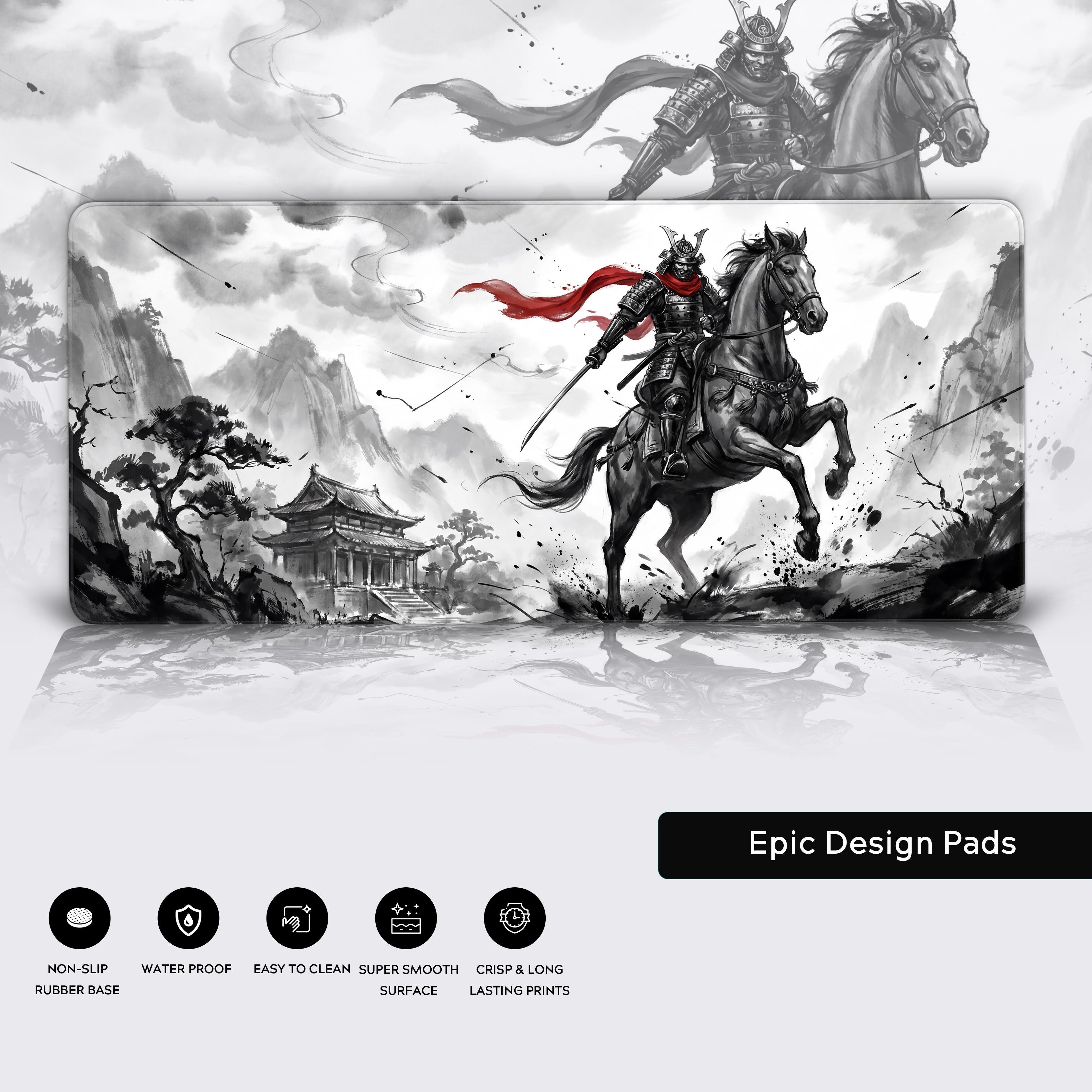 In a world of gray, be the singular flash of crimson. The Crimson Rider desk mat captures the moment of breakthrough, rendered in the powerful, sweeping strokes of traditional Japanese ink wash. It's a statement piece for those who move with purpose and conviction.