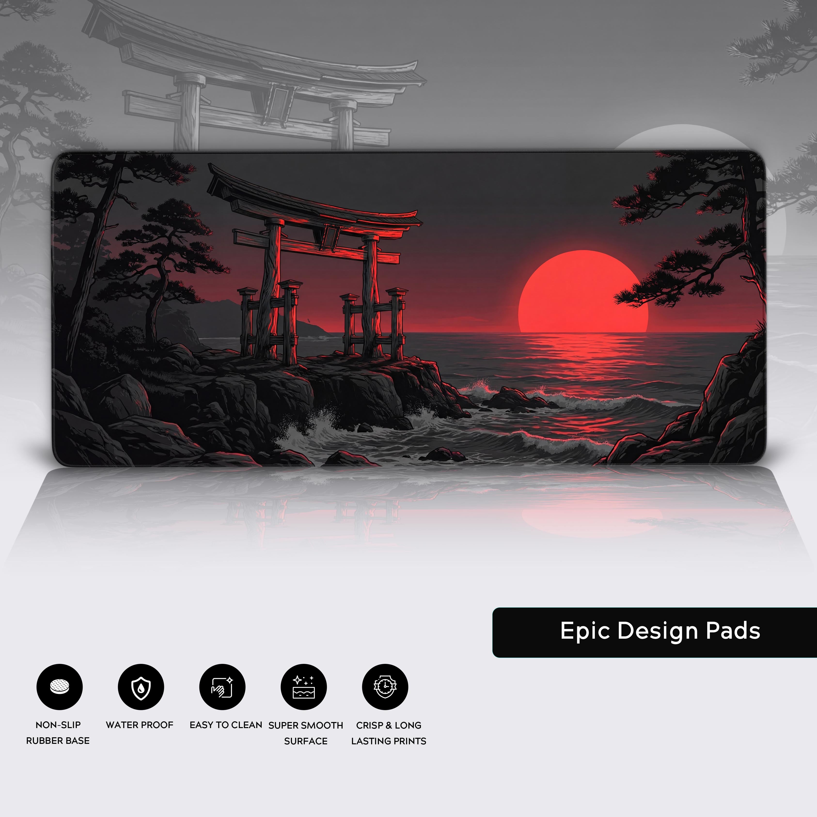 Your desk is more than just a surface; it's a sacred space for creation and focus. The Crimson Threshold desk mat, with its stoic Torii gate poised against a chaotic ocean and burning red sun, marks the boundary between distraction and deep work. Transform your setup into a bastion of productivity.