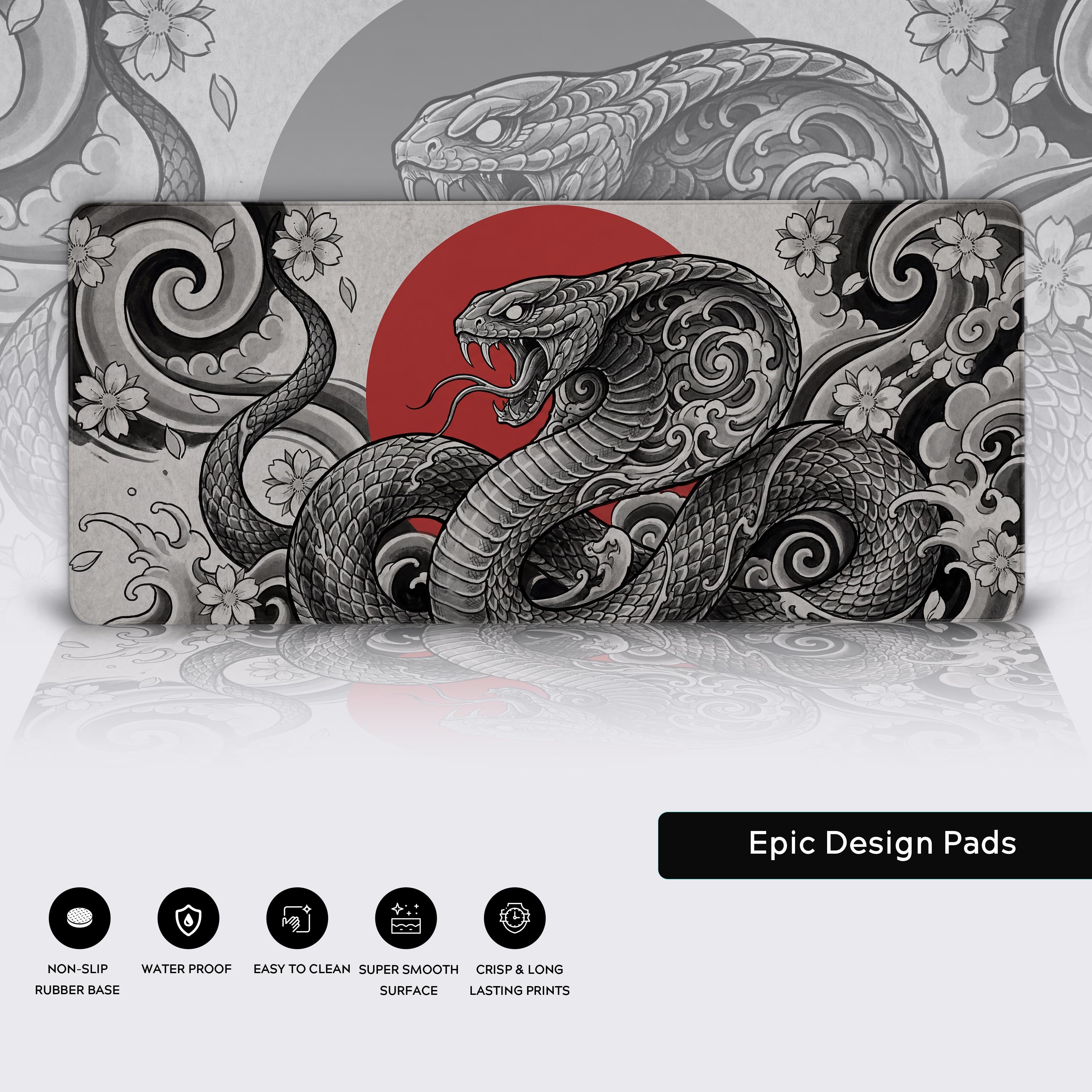 Channel the transformative power of the serpent with the Crimson Viper desk mat. Inspired by traditional Japanese ink-work, this design captures a cobra poised before a blood-red sun—a symbol of rebirth, protection, and lethal accuracy. It's not just an accessory; it's a statement for those who evolve and execute.