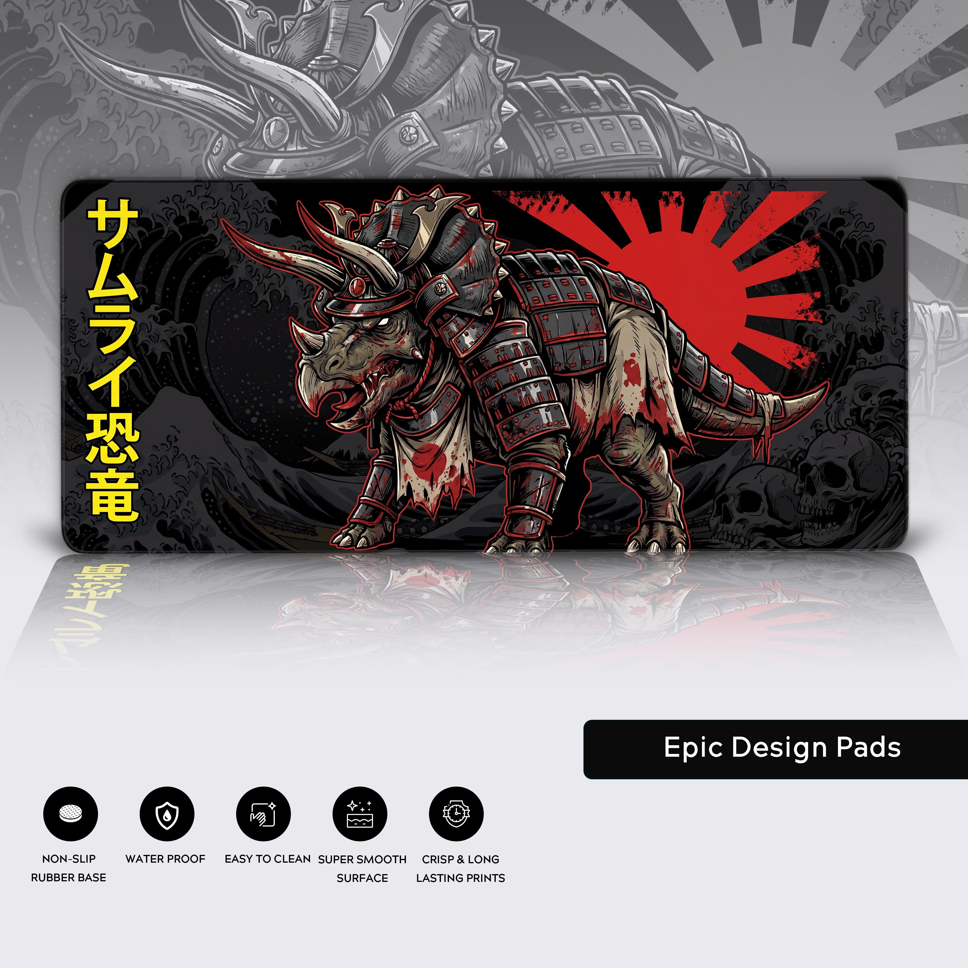 What happens when the unbreakable defense of the prehistoric world adopts the unyielding code of the samurai? You get the Iron Triceratops—a desk mat that's less of an accessory and more of a declaration. Dominate your digital battlefield with a design that blends primal power with feudal discipline, featuring a shogun-armored Triceratops against a blood-red rising sun.