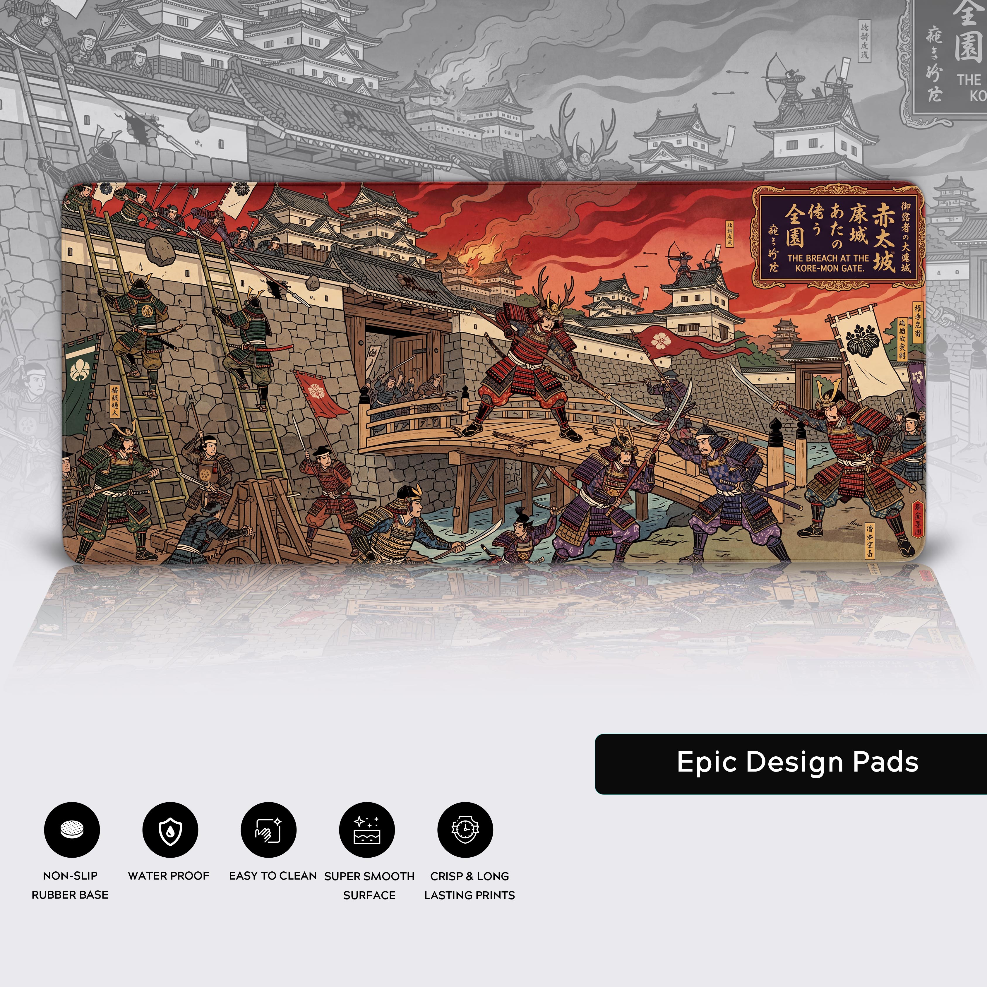 Some desks are for relaxing. Yours is for conquest. The 'Kore-mon Breach' desk mat captures the brutal, dynamic energy of a feudal Japanese siege, throwing you directly into the fray. Rendered in the iconic style of Ukiyo-e woodblock prints, this design is a masterclass in strategic chaos.