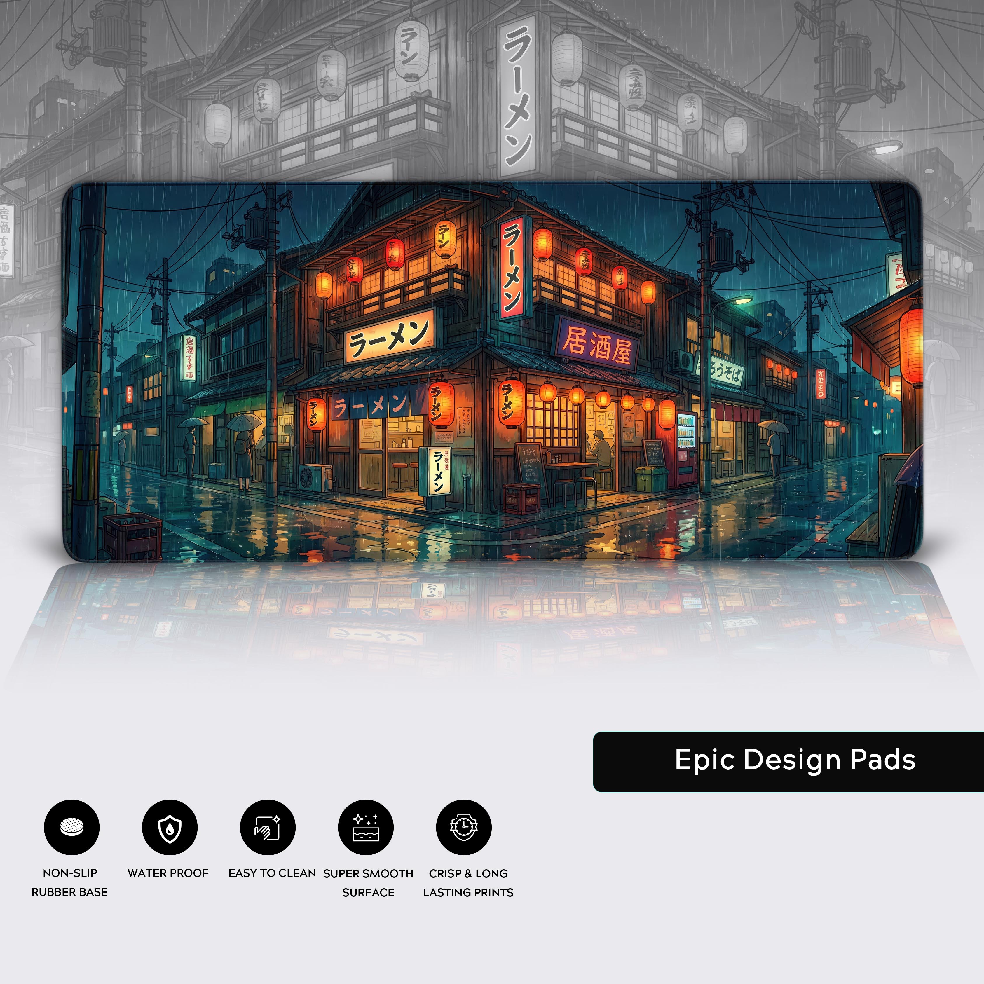 When the world outside is cold and chaotic, the Rainy District desk mat transforms your workspace into a glowing refuge. This design captures the quiet energy of a rain-slicked city street at night, where the warm, amber light of an izakaya offers a haven from the storm. It’s a visual reminder to keep your inner fire burning, no matter the pressure.