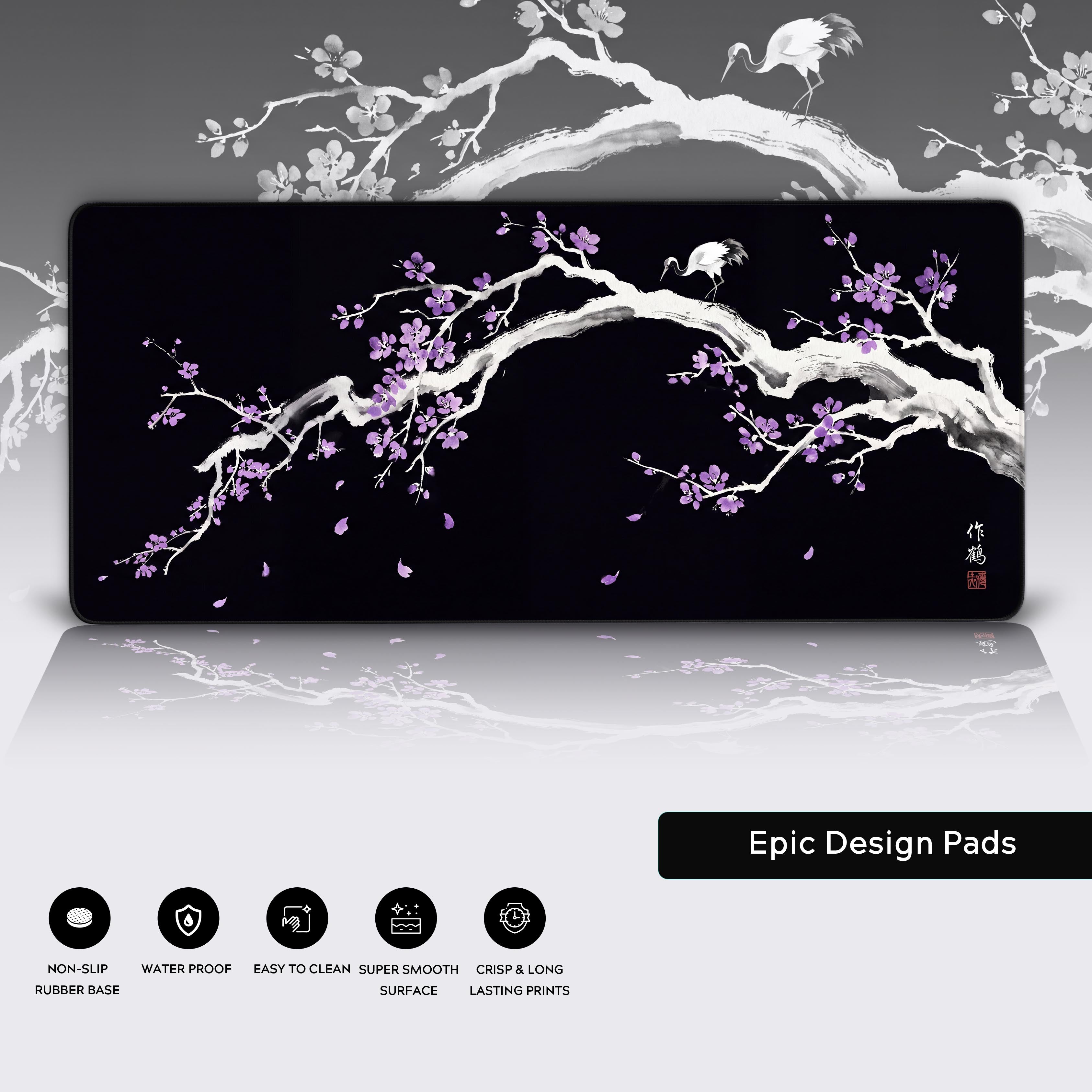 Transform your desk from a mere surface into a gallery piece. The Royal Sakura design captures a scene of profound elegance, featuring a stark, ink-wash branch adorned with royal purple blossoms and a solitary crane. It's a statement of sophistication and depth for those who appreciate a moody, distinct aesthetic.
