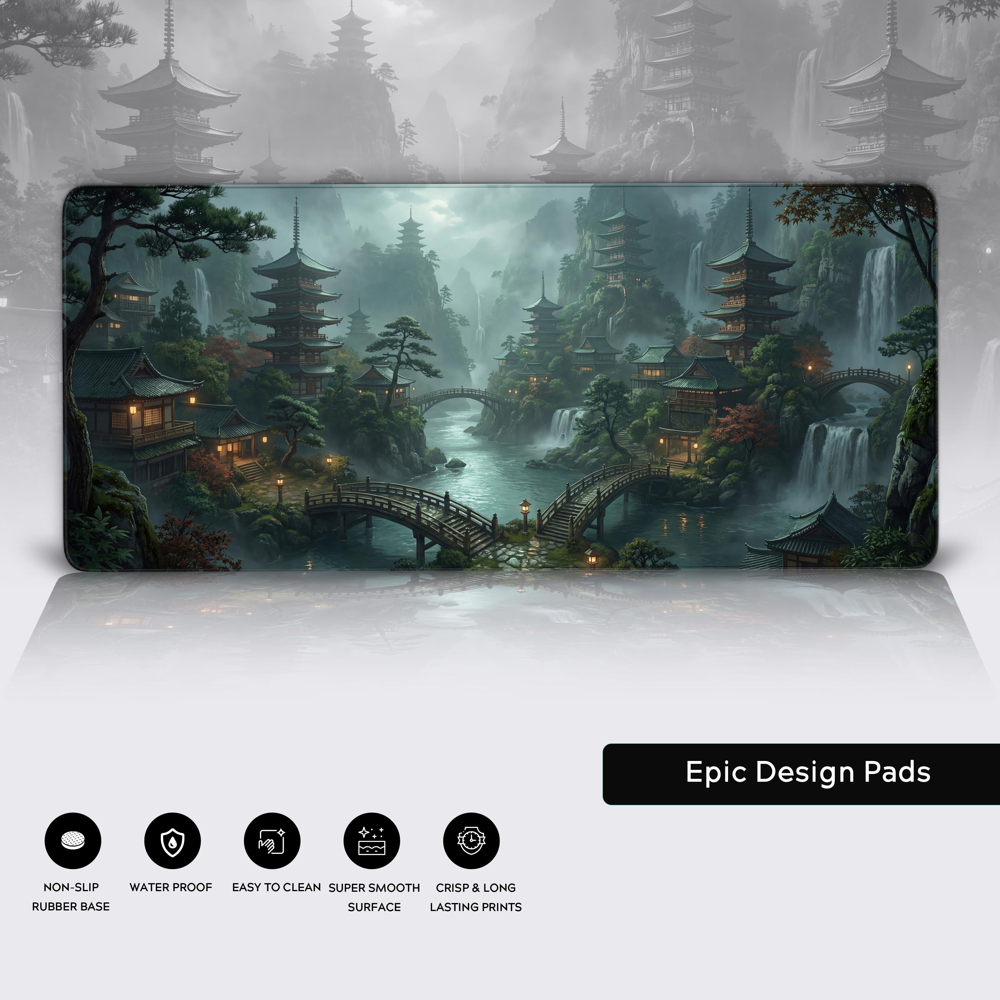 In a world that constantly screams for your attention, the Silent Pagoda desk mat offers a sanctuary of calm. This design transports you to a hidden valley where misty pagodas rise above the fog, and quiet rivers flow beneath ancient stone bridges. It's a visual reminder to silence the chaos and find clarity.