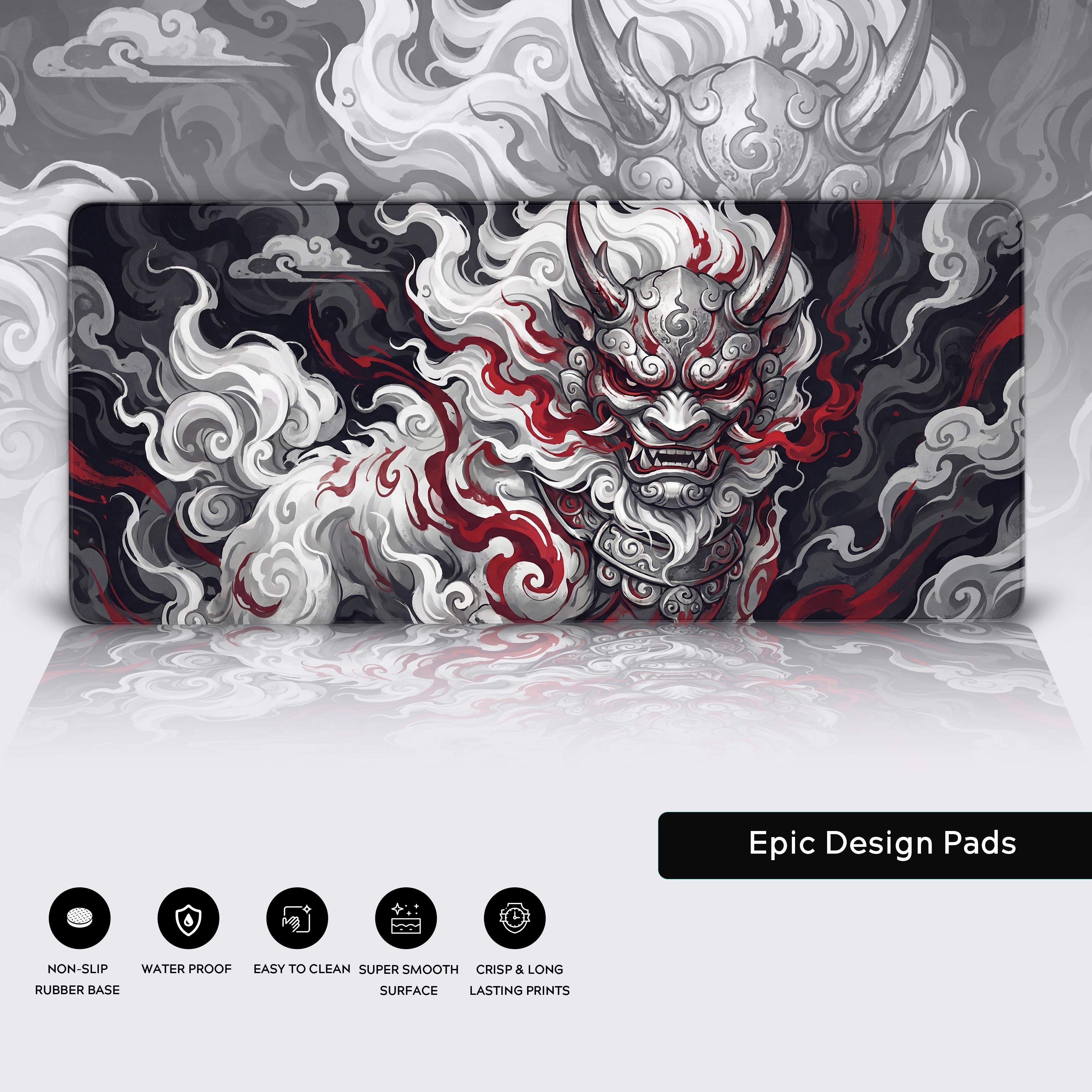 Guard your setup with the ferocious power of the Smoke Sentinel. This desk mat captures the ancient spirit of the Komainu, the mythical lion-dog, brought to life in a storm of ethereal smoke and burning crimson energy. It’s not just an accessory; it’s a statement of strength and protection for your sacred space.