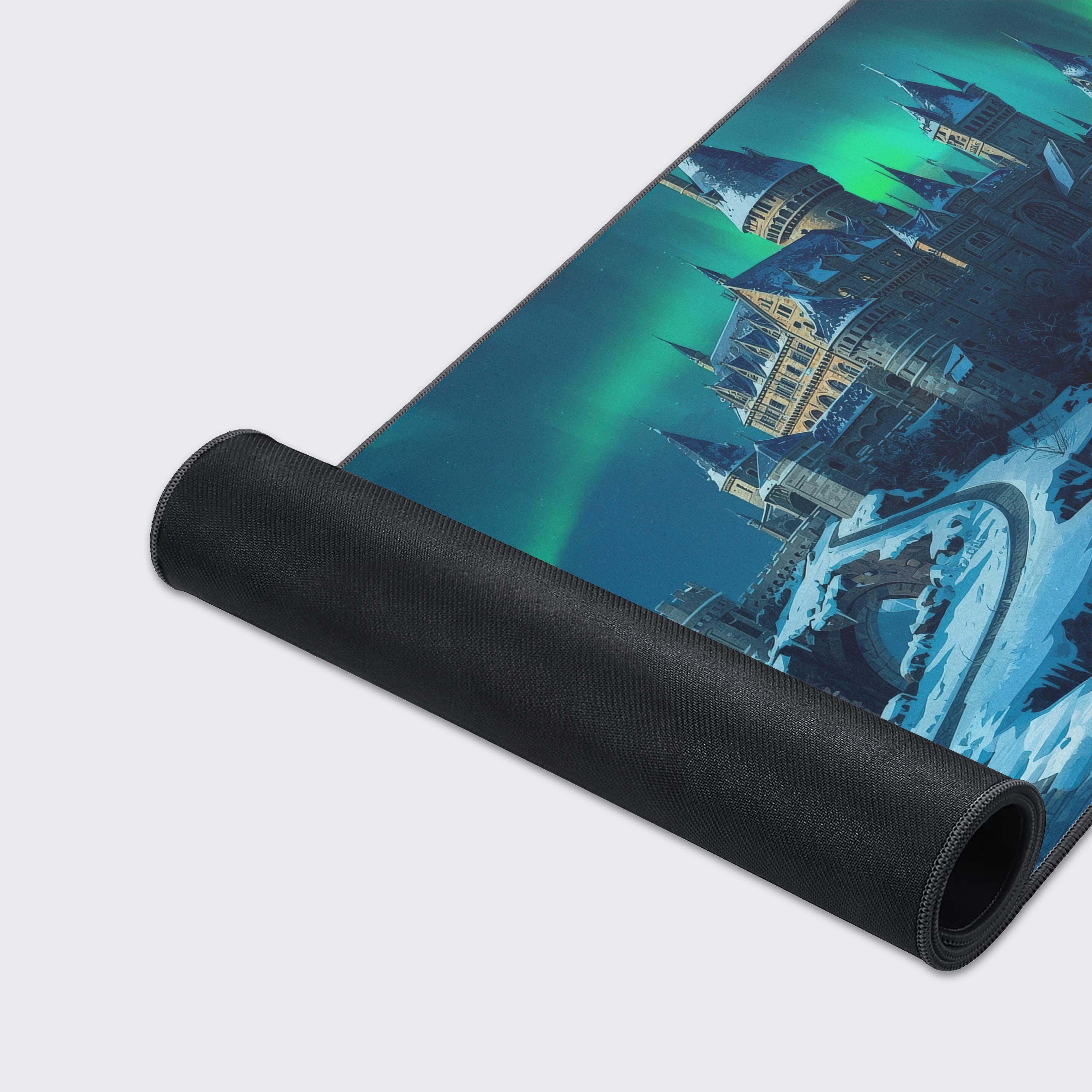 Above, the sky dances with the ethereal glow of the aurora borealis, casting a mystical light upon the frozen landscape. This serene yet powerful atmosphere is perfect for fueling creativity or immersing you in epic gaming sagas. The cool, harmonious palette brings calm and wonder to your workspace.