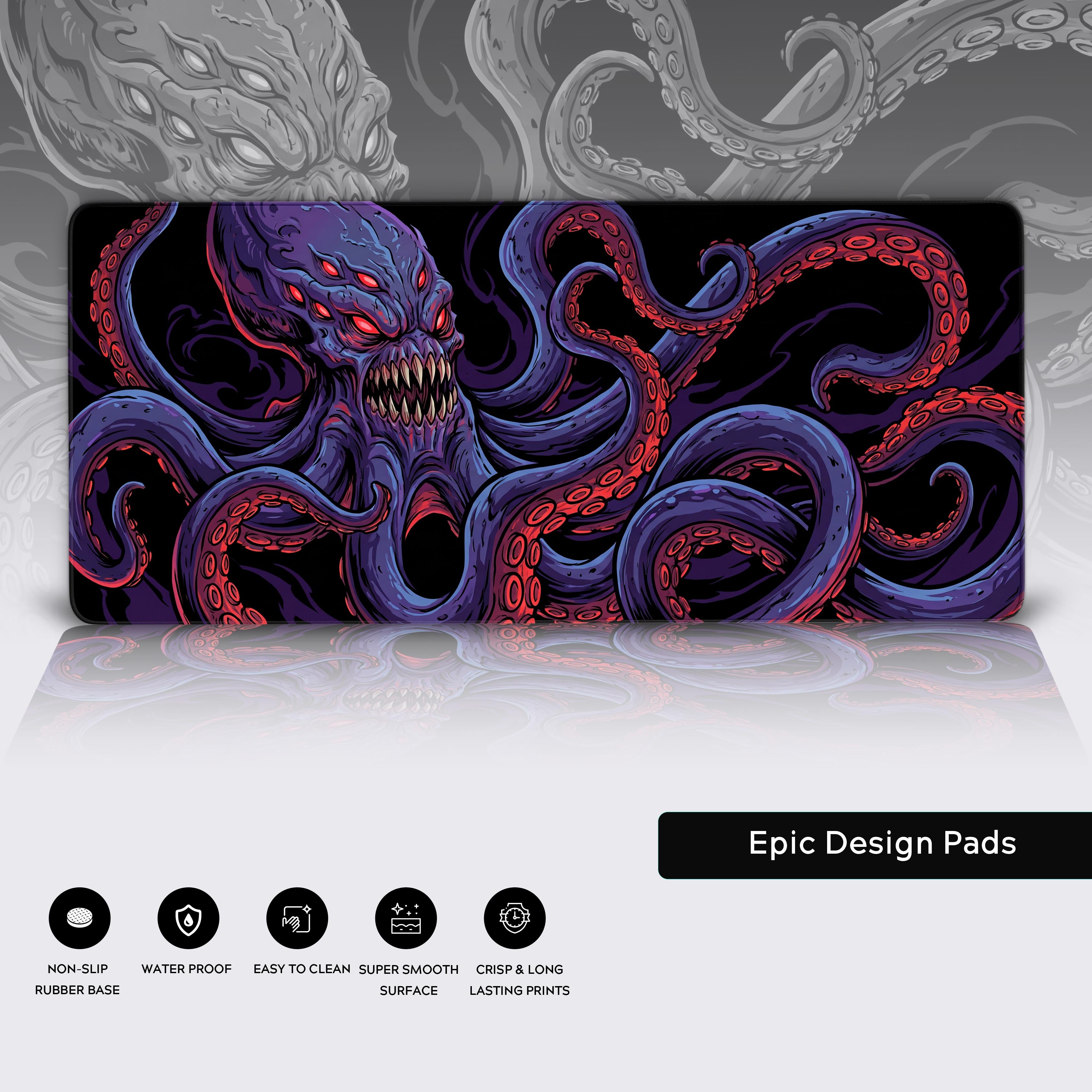 Stare into the abyss and let it empower you. The Deep Terror desk mat brings the awe-inspiring power of Lovecraftian horror straight to your setup. This isn't just a monster; it's a symbol of untamable strength, with piercing red eyes that see every threat and writhing tentacles that master every task.