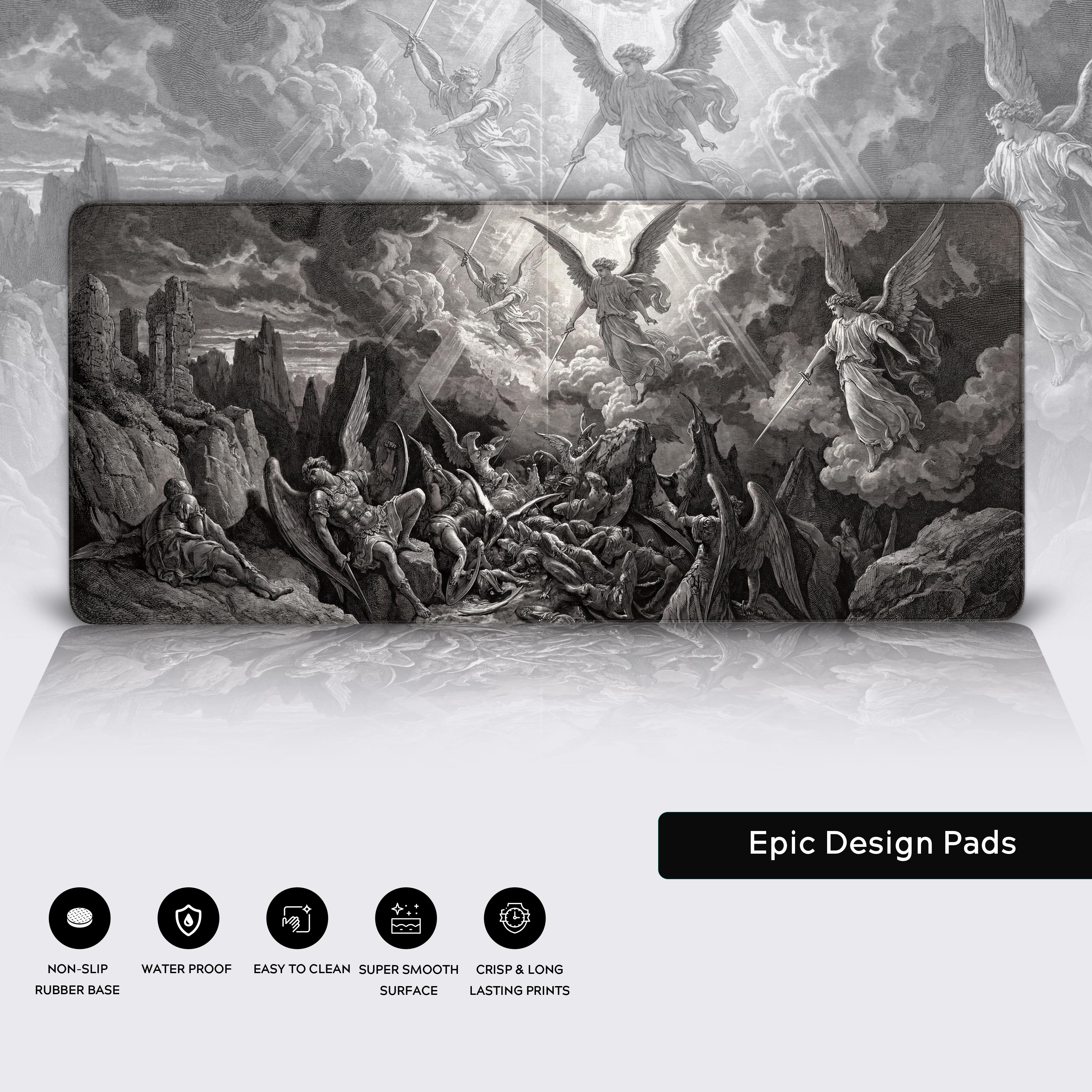 Capture the raw, epic moment of the War in Heaven with the Divine Conflict desk mat. This isn't just a surface; it's a theater of conflict, rendered in the intricate, brutal style of a master engraving. Watch as celestial warriors descend with swords of light, casting the rebellious into the unforgiving depths below.