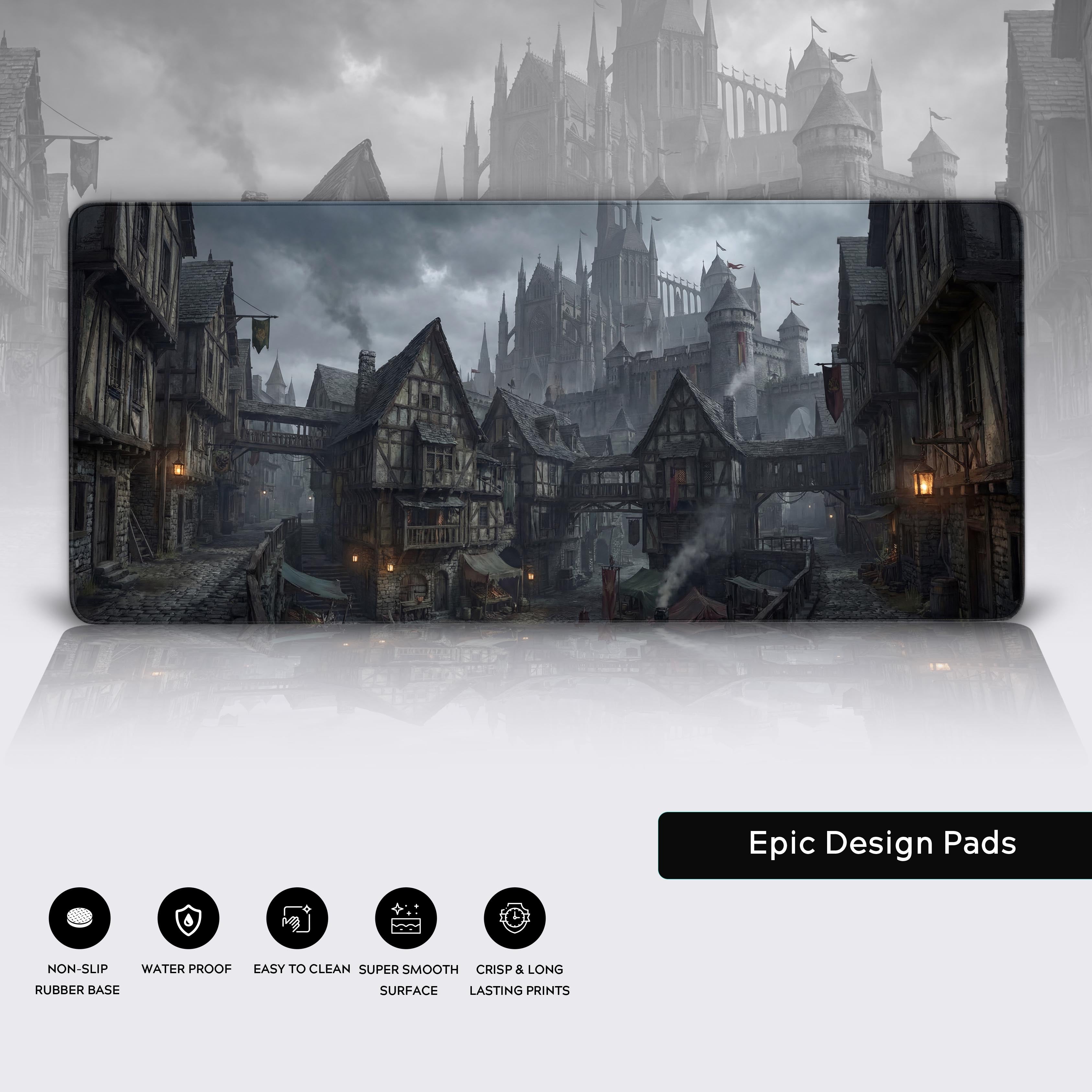 Transform your desk into a gateway to a legendary citadel. The Misty Borough design immerses you in a sprawling, gothic city where timber-framed homes huddle under the watch of ancient spires. Every detail, from the weathered cobblestones to the warm glow of tavern lanterns, creates an atmosphere of mystery and endurance.