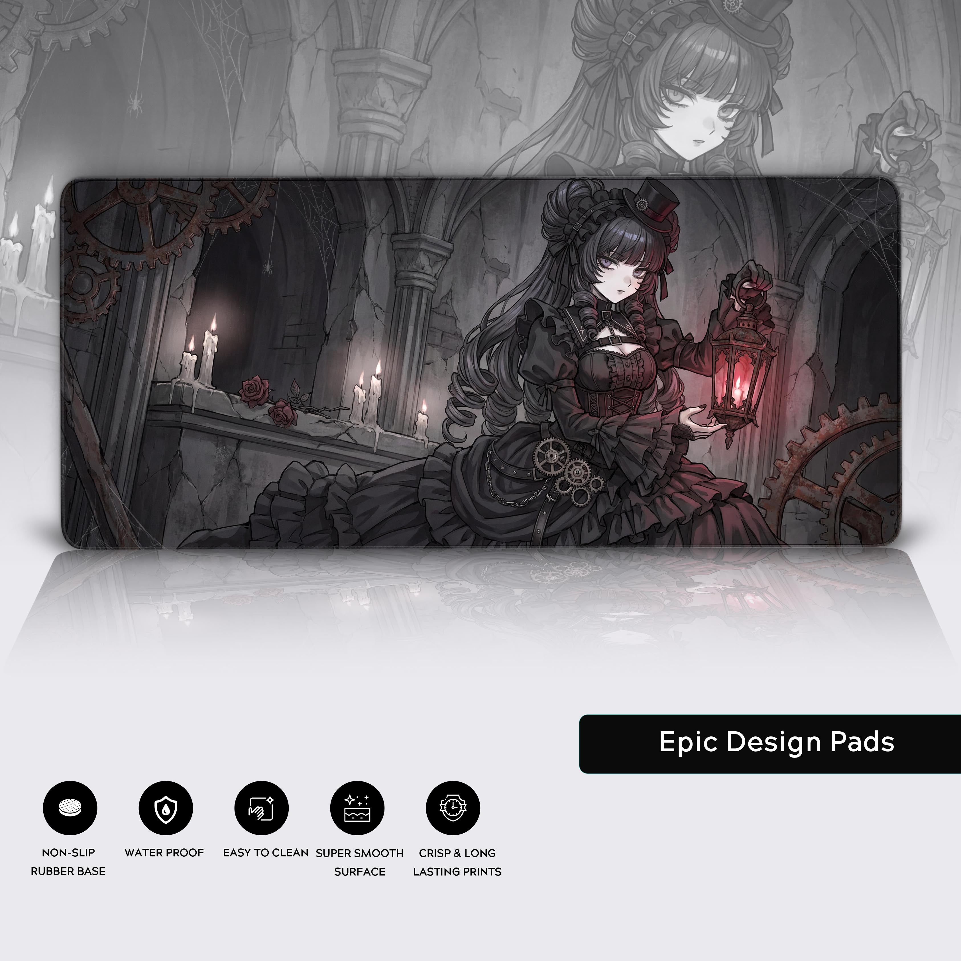 Immerse yourself in the haunting beauty of the Shadowed Vigil desk mat. This design transforms your desk into a gothic sanctuary where Victorian elegance meets industrial decay. Follow the keeper of lost time through a ruined crypt, her lantern the only warmth in a world of stone and rusted gears.
