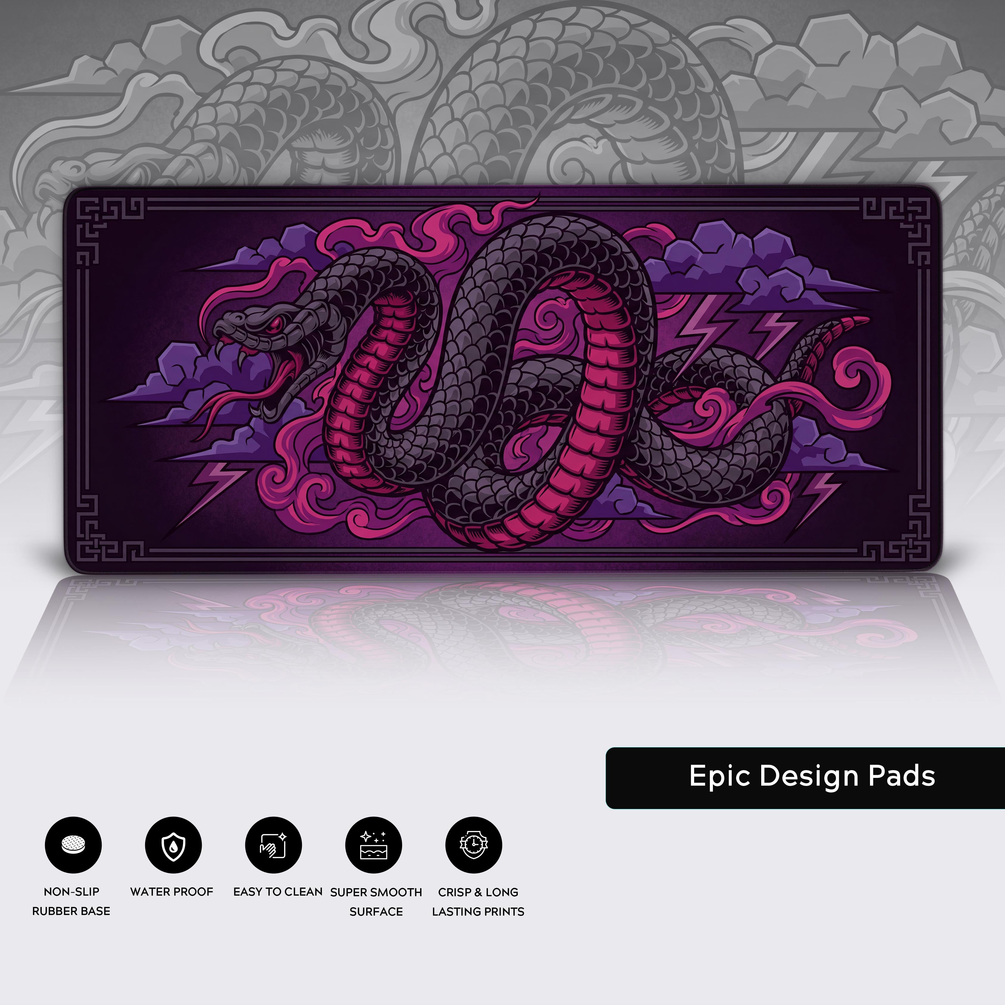 Transform your desk into a domain of strategy and control with the Storm Serpent desk mat. This design isn't just about aesthetics; it's a symbol of wisdom, transformation, and the power that thrives in chaos. The coiled serpent reminds you to be patient, to prepare, and to strike at the perfect moment.