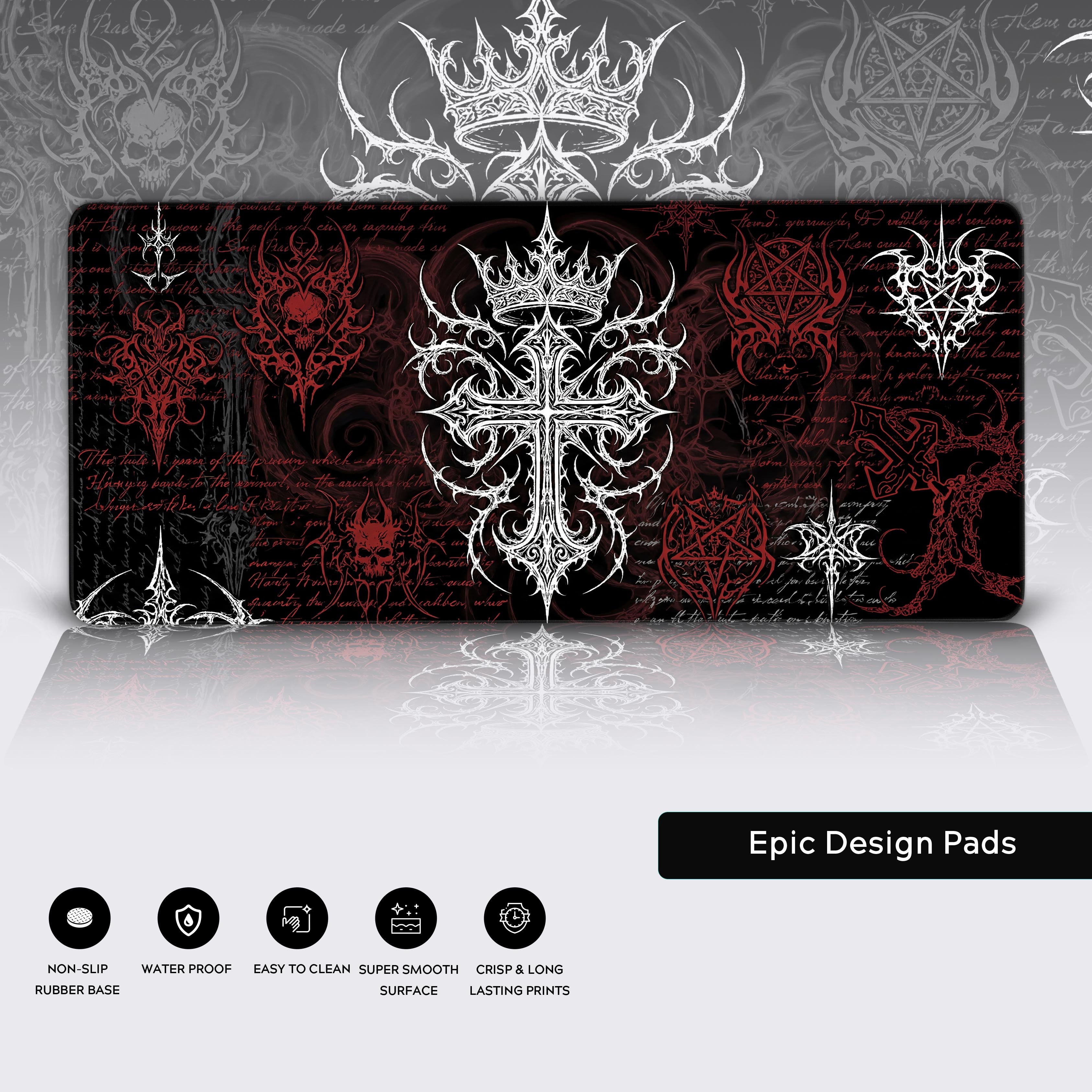Transform your workspace into an altar of focus with the Vanquished Cross desk mat. At its heart, a crowned cross stands as a bold symbol of self-sovereignty, flanked by ancient sigils reimagined in sharp, high-contrast detail. The deep crimson and bone-white graphics leap from the blackened backdrop, creating a powerful, ritualistic aesthetic.