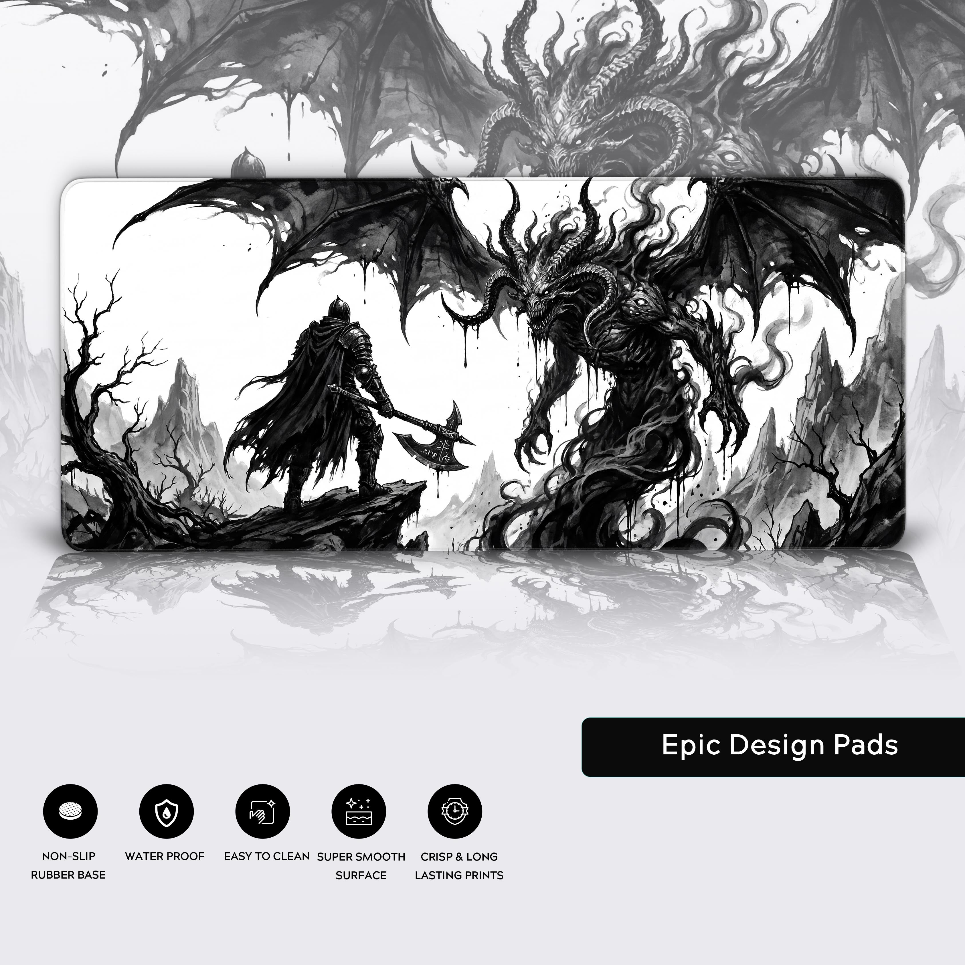 Transform your desk into a battlefield of legends with the Abyssal Confrontation desk mat. Rendered in a stunning traditional sumi-e ink wash style, this design captures the raw, visceral conflict between a lone knight and an overwhelming demonic force. It’s a powerful narrative of order versus chaos, stripped down to its black and white core.