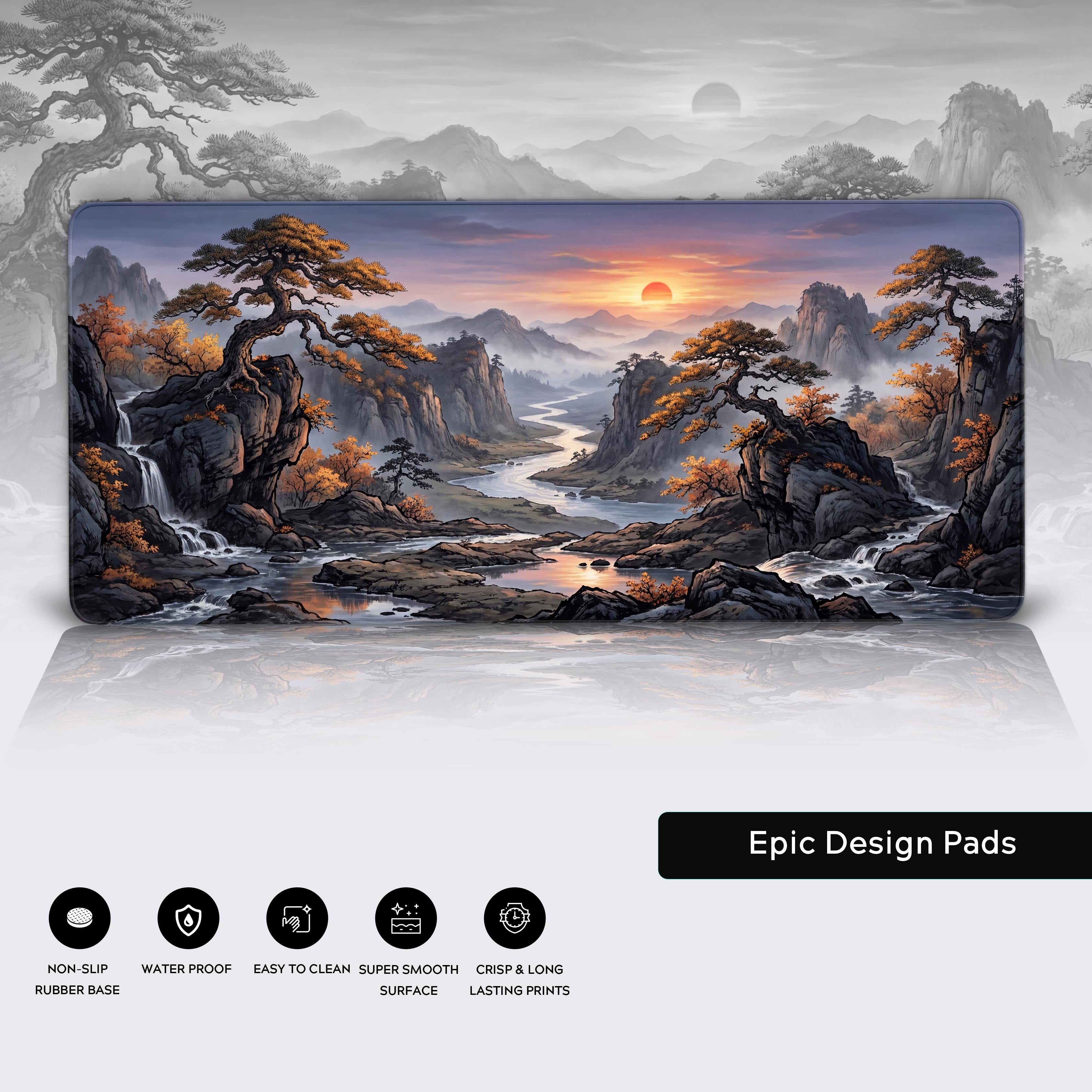 Transform your chaotic desk into a sanctuary of calm. Inspired by the timeless art of Shan Shui, the 'Amber Horizon' design captures a breathtaking landscape where resilient pines cling to misty cliffs, and a river flows endlessly toward a golden sunrise. It’s a visual meditation on resilience and perspective, grounding the high-tech energy of a modern workspace with enduring tranquility.