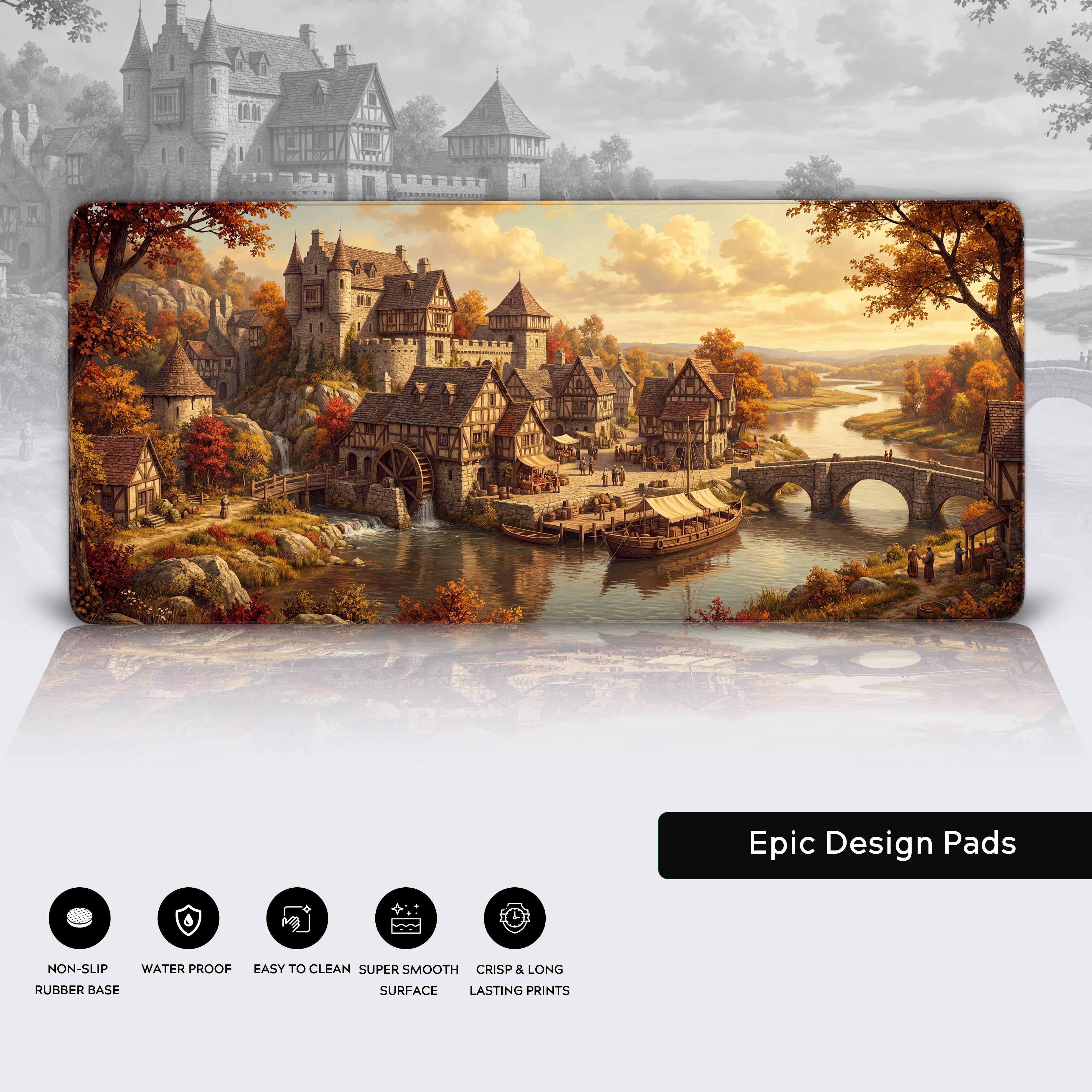 Transform your desk into a sanctuary of peace and productivity. This stunning desk mat depicts a timeless riverside hamlet, bathed in the warm, amber light of a perpetual autumn. Let the gentle flow of the river and the charming, handcrafted village inspire a sense of calm and focused work.