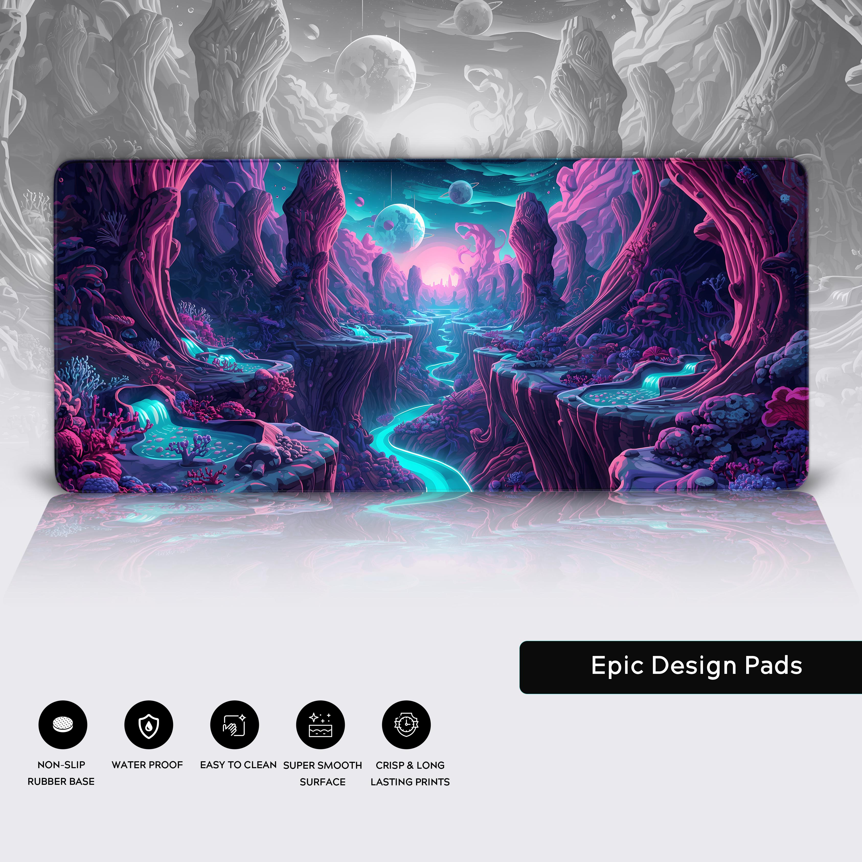 Is your desk just a desk, or is it a portal to another dimension? The Celestial Valley design transforms your workspace into a breathtaking alien landscape. Follow the liquid starlight river as it winds through a canyon of towering, organic sentinels, all under the gaze of multiple moons suspended in a vibrant magenta sky.