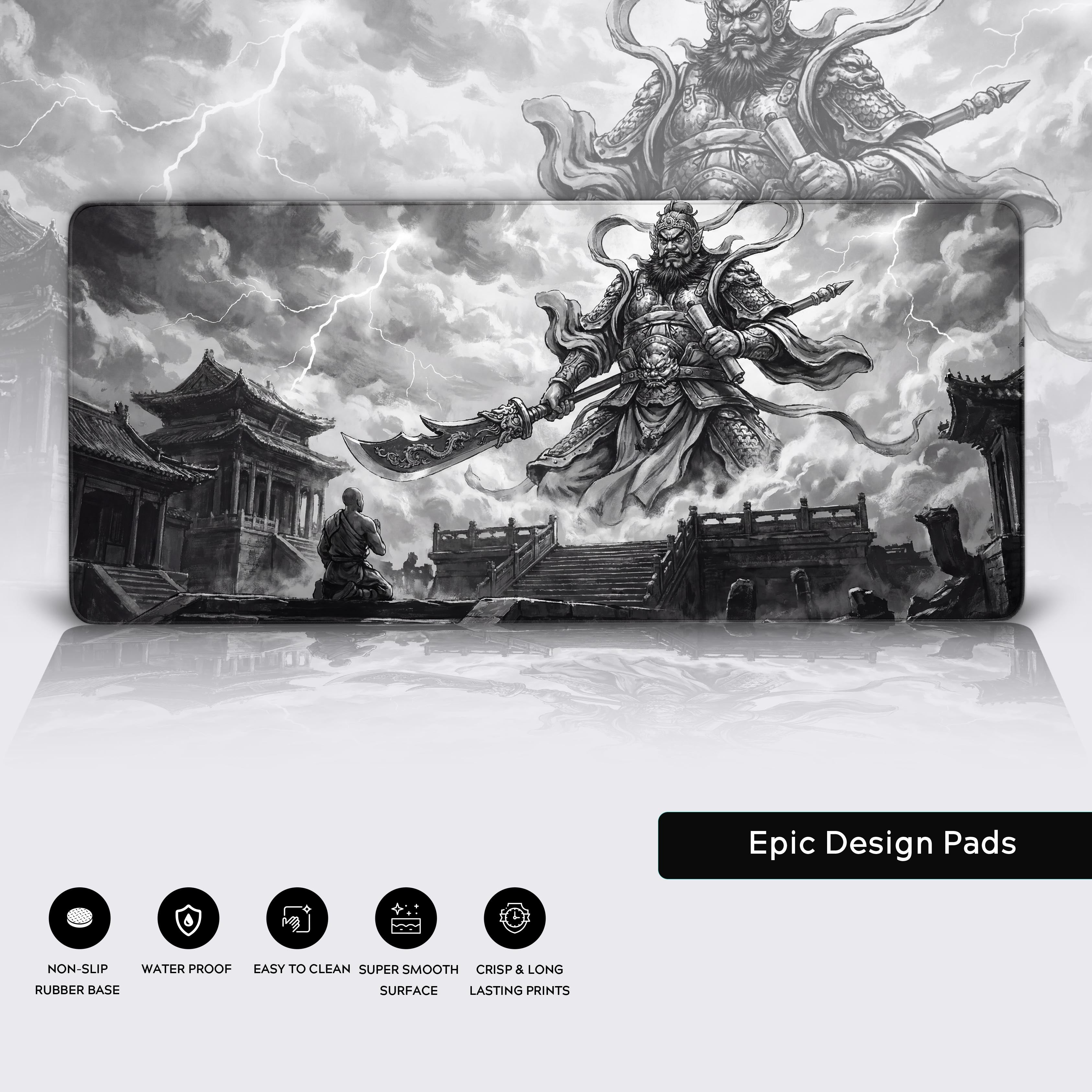 Witness the awe-inspiring power of the Cloud Deity desk mat. This stunning monochrome design captures a celestial general, a god of war parting the heavens to gaze upon a lone, kneeling monk. It's a powerful study in the balance between divine might and mortal reverence, rendered in breathtaking detail.