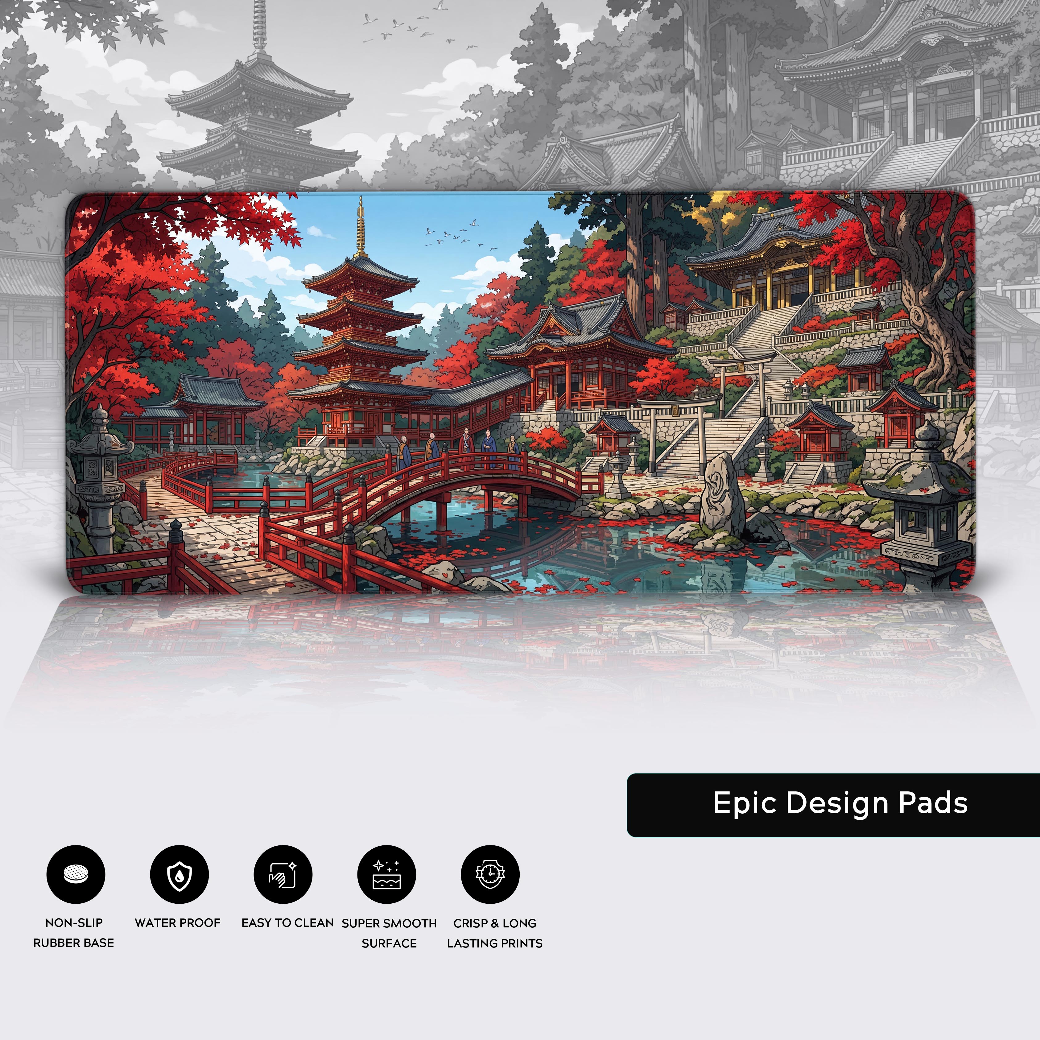 Dominated by the aggressive reds of an autumn canopy clashing against ancient temple architecture, this anime-inspired design is a piece of absolute aesthetic mastery. The intricate detail provides a stunning visual backdrop for any setup, transforming cheap particle board into a canvas of enduring art.