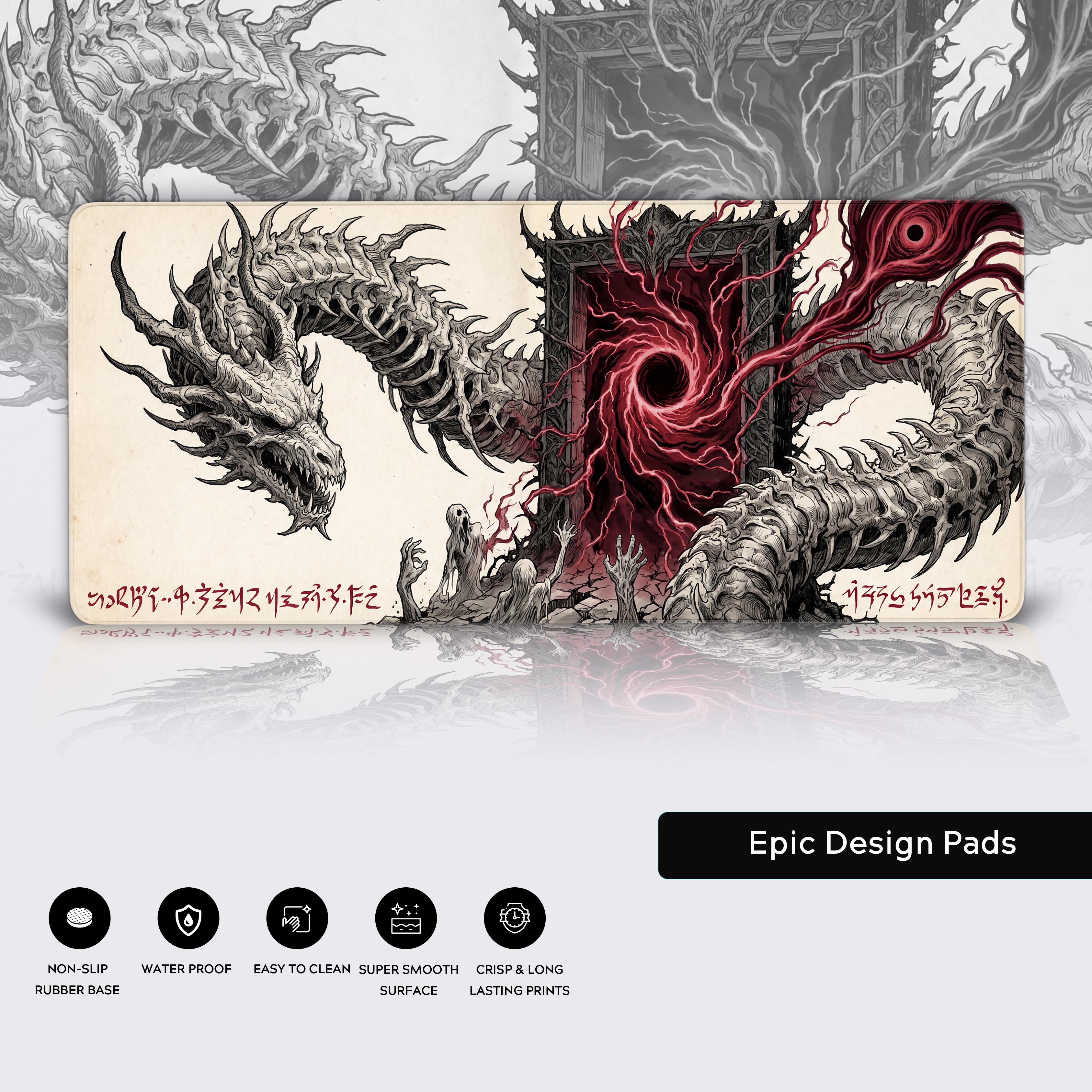 Is your desk merely a surface, or is it an altar to the arcane? The Crimson Portal desk mat transforms your workspace into a scene from a forbidden tome. Witness the skeletal ouroboros, a timeless wyrm of destruction and rebirth, as it weaves through a bleeding wound in reality itself.