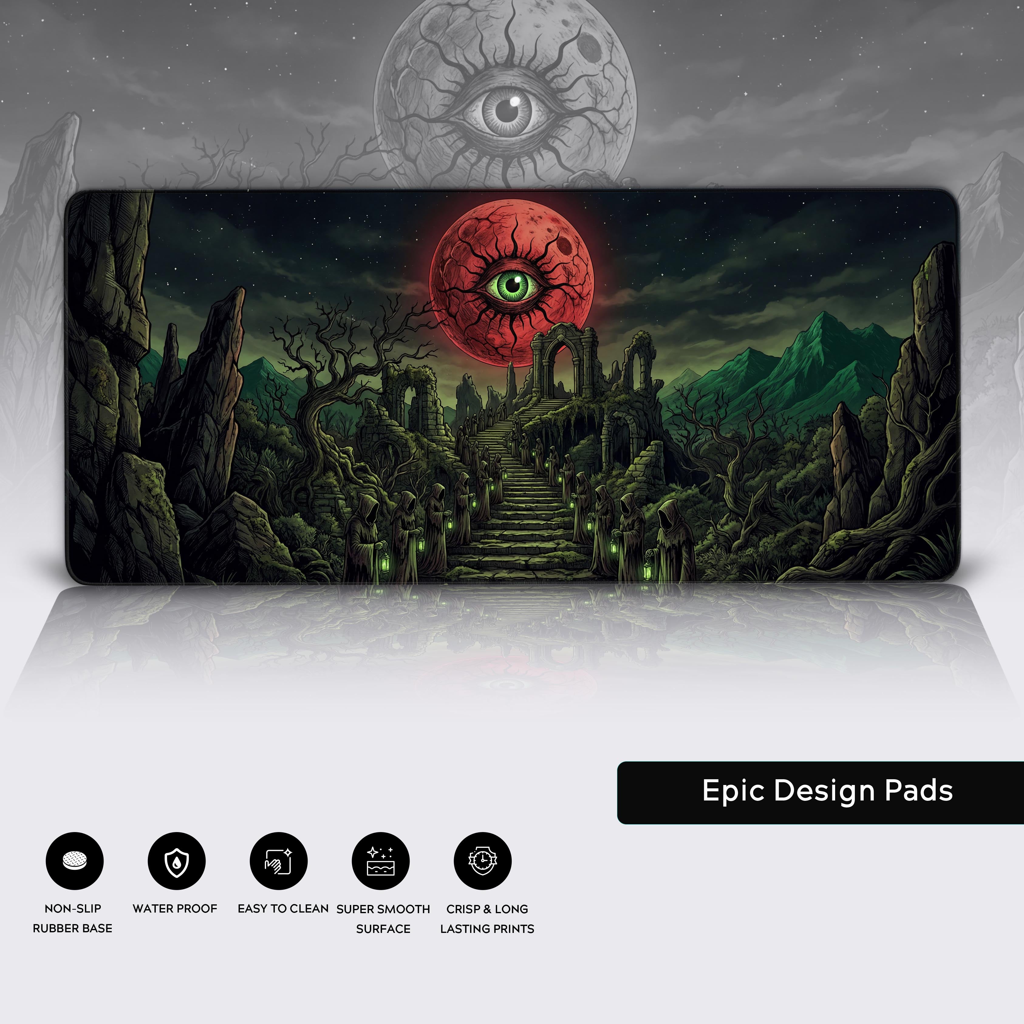 Is your desk just a surface, or is it a portal? The Crimson Ritual desk mat transforms your setup into a scene of esoteric power. Dominated by a terrifying and mesmerizing crimson eye in the sky, this design captures the moment a dark procession seeks forbidden knowledge in a world of shadow and ruin.
