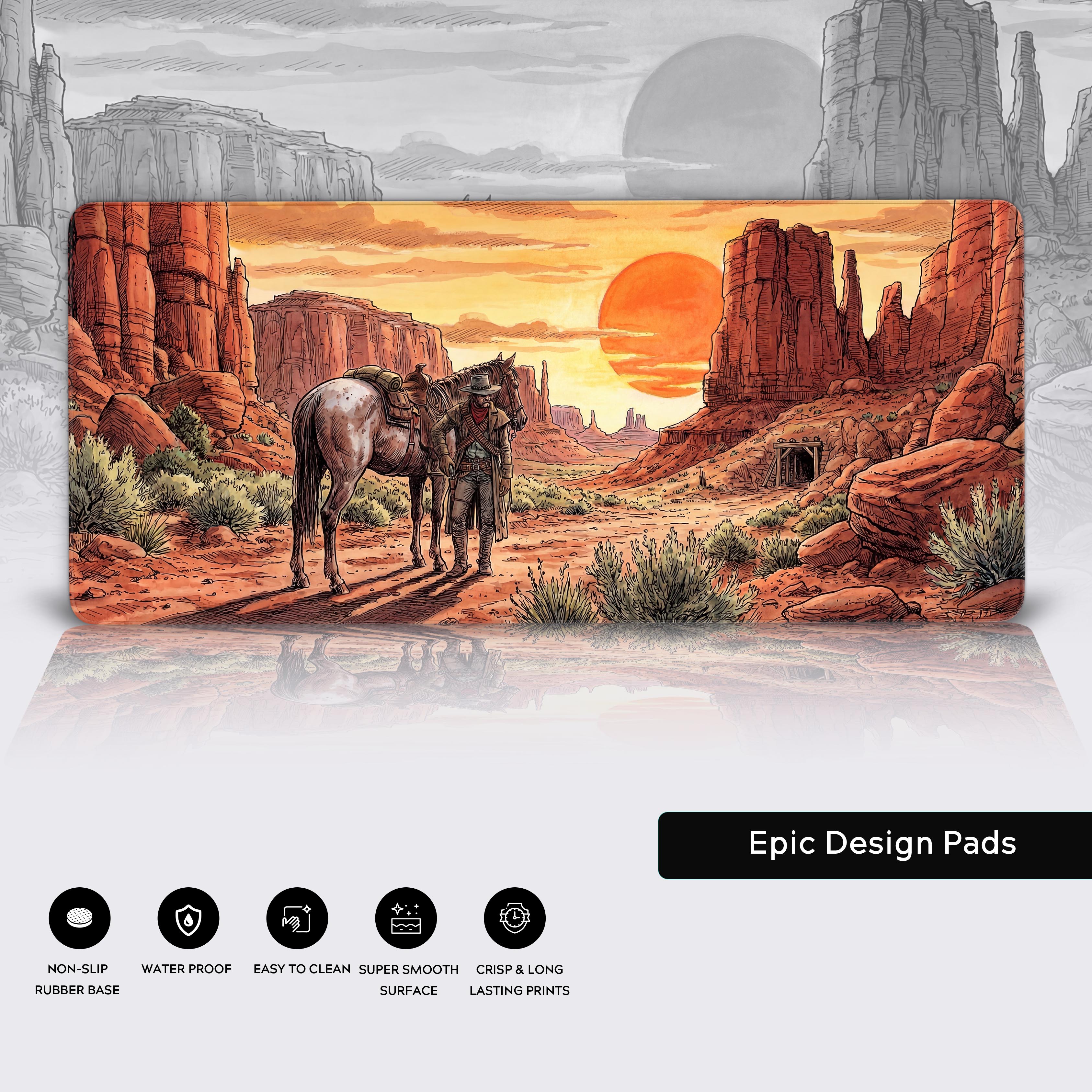 Transform your desk into a scene from the American West with the Desert Wanderer desk mat. This stunning design captures the quiet moment of a cowboy and his horse against a backdrop of majestic canyons under a setting sun, rendered in a classic graphic novel style.