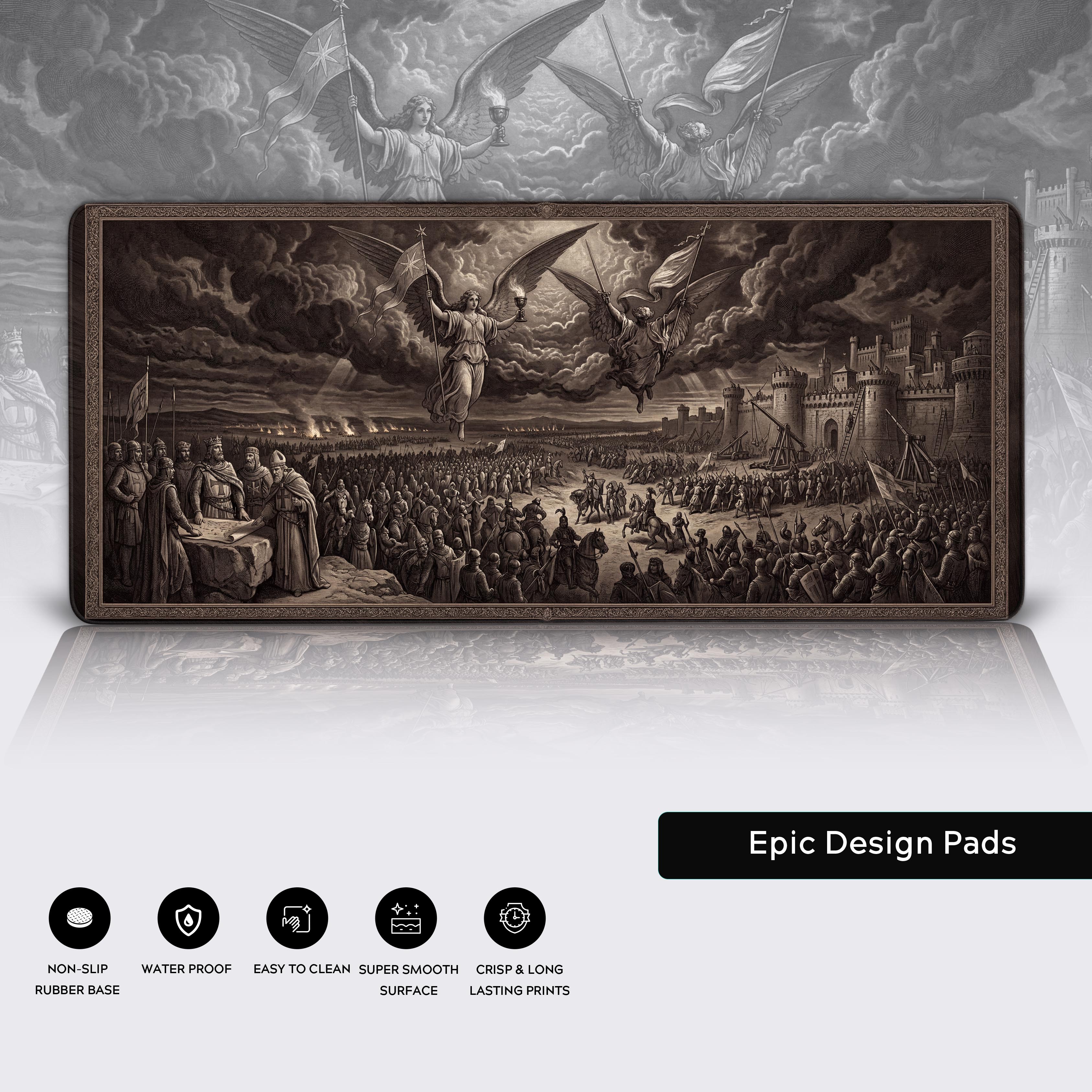 Transform your workspace into a grand war table with the Divine Siege desk mat. This stunning monochromatic masterpiece, rendered in a classical engraving style, depicts an epic conflict where kings strategize, armies clash, and celestial beings oversee the fray. It's more than a mouse pad; it's a statement of ambition and control.
