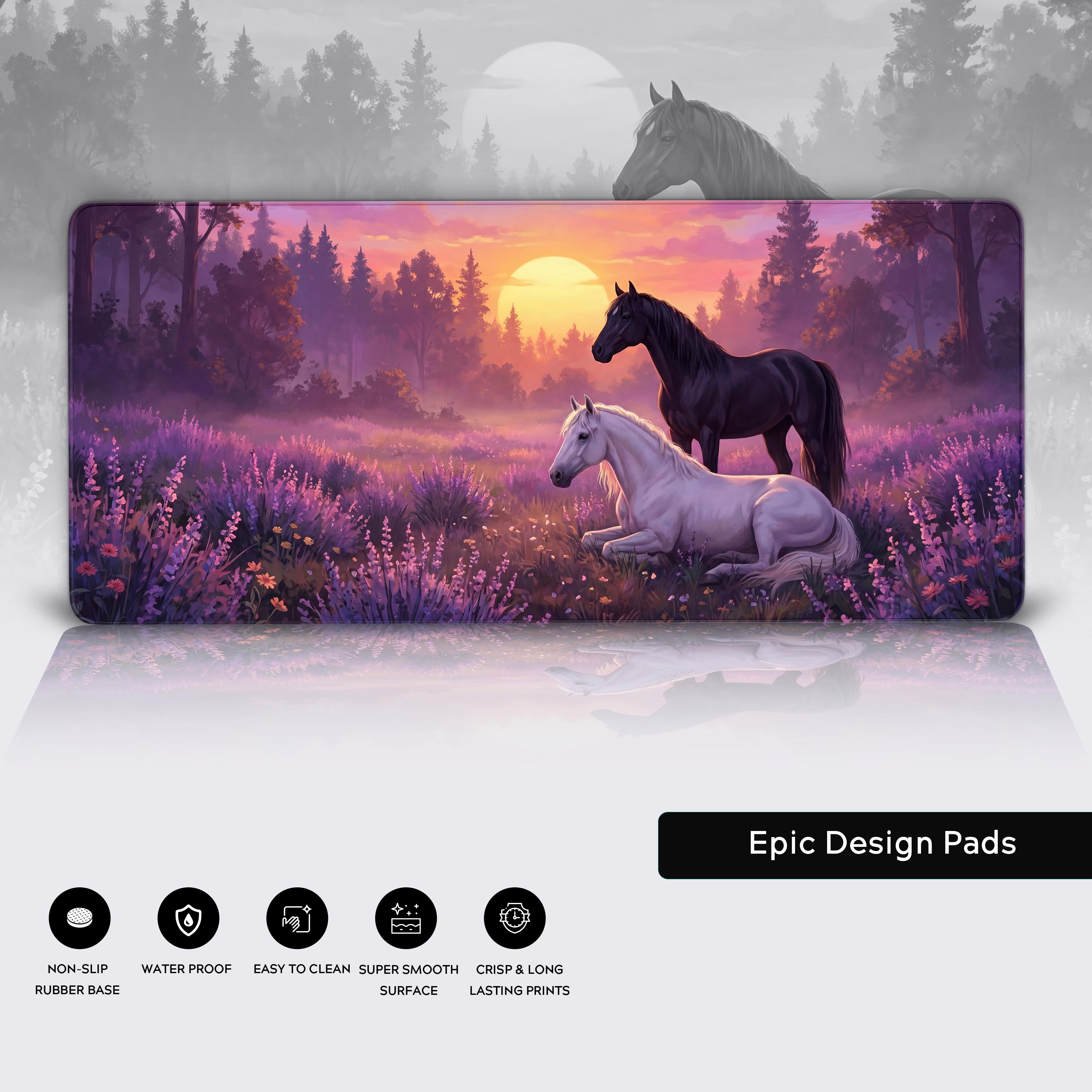 Let the Equine Harmony desk mat transform your workspace into a serene landscape. This stunning design captures a moment of perfect balance, where a powerful black stallion and a peaceful white mare rest in a field of lavender at twilight. It's a daily reminder of the quiet strength found in stillness.
