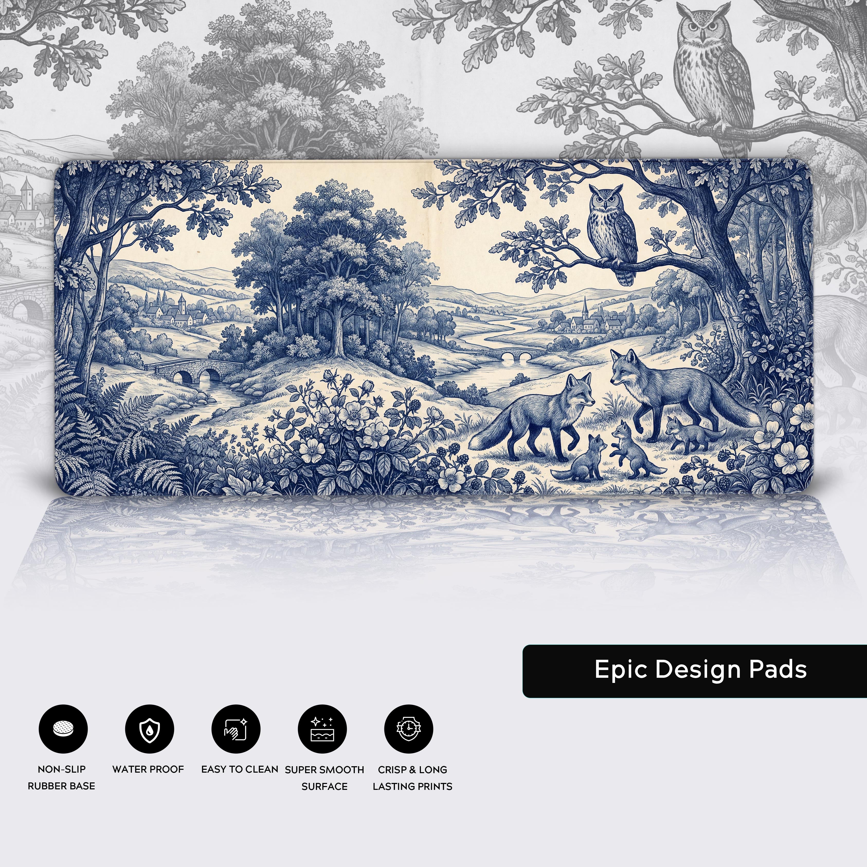 Step into the serene world of Foxwood Toile, where a classic storybook narrative unfolds across your workspace. This beautifully illustrated desk mat, rendered in a vintage blue and cream toile style, captures a quiet moment in a forest sanctuary. It's more than just a desk accessory; it's an invitation to a world of reflection and steady growth.